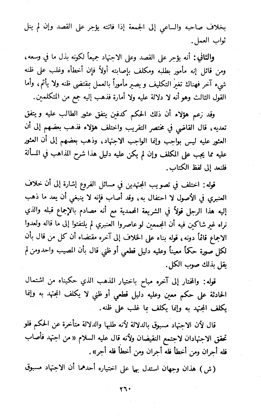 والثاني:أنه يؤجر على القصد وعلى الاجتهاد جميعا لكونه بذل ما في وسعه ومن قائل إنه مأمور بطلبه ومكلف بإصابته أولا فإن أخطأه وغلب على ظنه شيء آخر فهناك تغير التكليف ويصير مأمورا بالعمل بمقتضى ظنه ولا يأثم وأما القول الثالث وهو أنه لا دلالة عليه ولا أمارة فذهب إليه جمع من المتكلمين