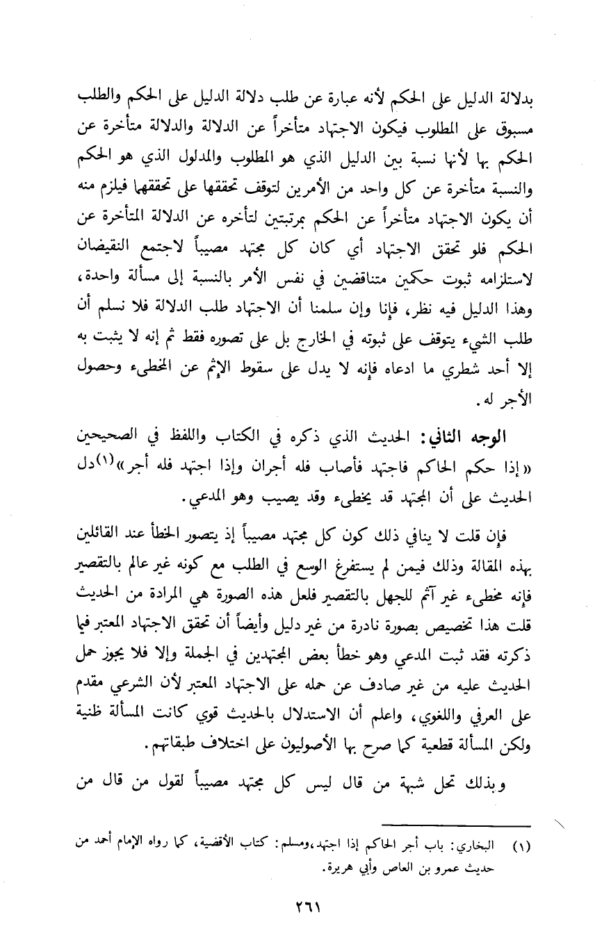 الوجه الثاني:الحديث الذي ذكره في الكتاب واللفظ في الصحيحين:"إذا حكم الحاكم فاجتهد فأصاب فله أجران وإذا اجتهد فله أجر1" دل الحديث على أن المجتهد قد يخطئ وقد يصيب وهو المدعي