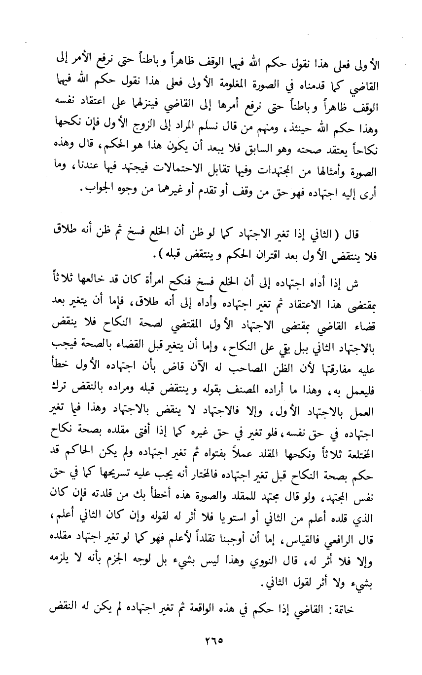 قال "الثاني إذا تغير الاجتهاد كما لو ظن أن الخلع فسخ ثم ظن أنه طلاق فلا ينتقض الأول بعد اقتران الحكم وينتقض قبله"