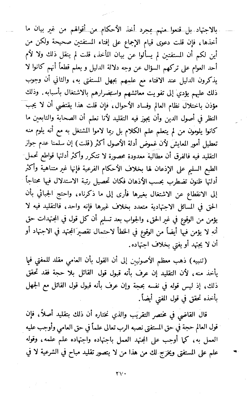 بالاجتهاد بل قنعوا منهم بمجرد أخذ الأحكام من أقوالهم من غير بيان ما أخذها فإن قلت دعوى قيام الإجماع على إفتاء المستفتين صحيحة ولكن من أين لكم أن المستفتين لم يسألوا عن بيان المأخذ قلت لم ينقل ذلك ولا لأم أحد العوام على تركهم السؤال عن وجه دلالة الدليل ويعلم قطعا أنهم كانوا لا يذكرون الدليل عند الإفتاء مع علمهم بجهل المستفتي به والثاني أن وجود ذلك عليهم يؤدي إلى تفويت معائشهم واستضرارهم بالاشتغال بأسبابه وذلك مؤذن باختلال نظام العالم وفساد الأحوال فإن قلت هذا يقتضي أن لا يجب النظر في أصول الدين وأن يجوز فيه التقليد لأنا نعلم أن الصحابة والتابعين ما كانوا يلومون من لم يتعلم علم الكلام بل ربما لاموا المشتغل به مع أنه يلوم منه تعطيل أمور المعايش لأن غرض أدلة الكلام أكثر قلت إن سلمنا عدم جواز التقليد فيه فالفرق أن مطالبة معدودة محصورة لا تتكرر وأكثر أدلتها قواطع تحمل الطبع السليم على الإذعان لها بخلاف الأحكام الفرعية فإنها غير متناهية وأكثر أدلتها ظنون تضطرب بحسب الأذهان فكان تحصيل رتبة الاستدلال فيها محتاجا إلى الانقطاع عن الاشتغال بغيرها فأرى إلى ما ذكرناه واحتج الجبائي بأن الحق في المسائل الاجتهادية متعدد بخلاف غيرها فإنه واحد فالتقليد فيه لا يؤمن من الوقوع في غير الحق والجواب بعد تسليم أن كل قول في المجتهدات حق أنه لا يؤمن فيها أيضا من الوقوع في الخطأ لاحتمال تقصير المجتهد في الاجتهاد أو أن لا يجتهد أو يفتي بخلاف الاجتهاد