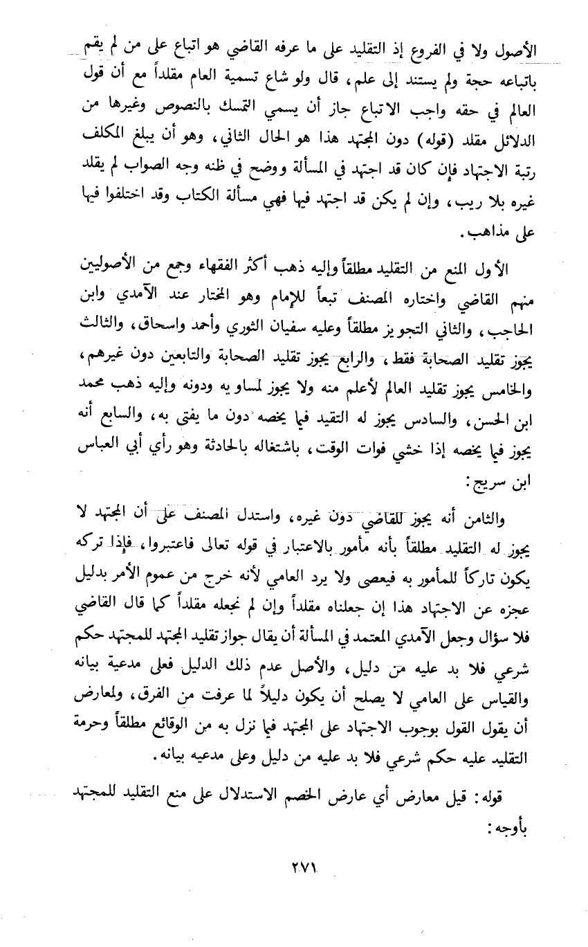 الأول المنع من التقليد وإليه ذهب أكثر الفقهاء وجمع من الأصوليين منهم القاضي واختاره المصنف تبعا للإمام وهو المختار عند الآمدي وابن الحاجب والثاني التجويز مطلقا وعليه سفيان الثوري وأحمد وإسحاق والثالث يجوز تقليد الصحابة فقط والرابع يجوز تقليد الصحابة والتابعين دون غيرهم والخامس يجوز تقليد العالم لأعلم منه ولا يجوز لمساويه ودونه وإليه ذهب محمد بن الحسن والسادس يجوز التقليد فيما يخصه دون ما يفتى به والسابع أنه يجوز فيما يخصه إذا خشي فوات الوقت باشتغاله بالحادثة وهو رأي أبي العباس ابن سريج