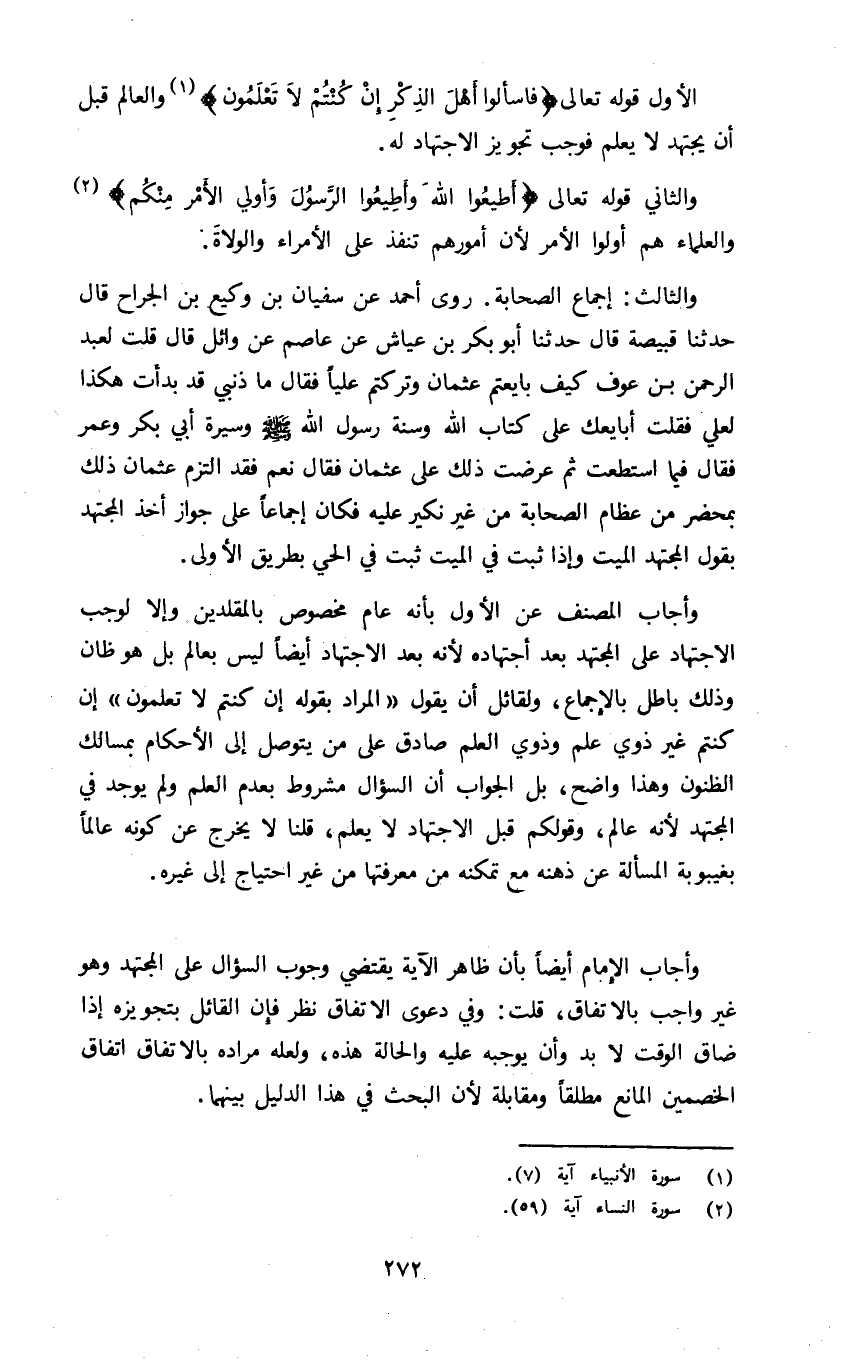 الأول قوله تعالى: {فَاسْأَلوا أَهْلَ الذِّكْرِ إِنْ كُنْتُمْ لا تَعْلَمُون1} والعالم قبل أن يجتهد لا يعلم فوجب تجويز الاجتهاد له