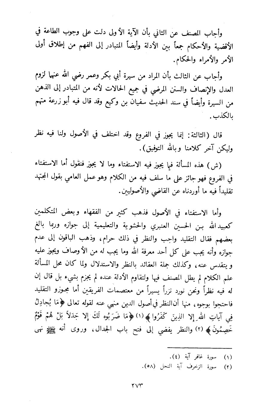 وأما الاستفتاء في الأصول فذهب كثير من الفقهاء وبعض المتكلمين كعبيد الله بن الحسين العنبري والحشوية والتعليمية إلى جوازه وربما بالغ بعضهم فقال التقليد واجب والنظر في ذلك حرام وذهب الباقون إلى عدم جوازه وأنه يجب على كل أحد معرفة الله وما يجب له من الأوصاف ويجوز عليه ويتقدس عنه وكذلك جملة العقائد بالنظر والاستدلال ولما كان محل المسألة علم الكلام لم يطل المصنف فيها ولتقاوم الأدلة عنده لم يجزم بشيء بل قال إن له فيه نظرا ونحن نورد نزرا يسيرا من معتصمات الفريقين أما مجوزو التقليد فاحتجوا بوجوه منها أن النظر في أصول الدين منهي عنه لقوله تعالى: {مَا يُجَادِلُ فِي آيَاتِ اللَّهِ إِلَّا الَّذِينَ كَفَرُوا1} {مَا ضَرَبُوهُ لَكَ إِلَّا جَدَلاً بَلْ هُمْ قَوْمٌ خَصِمُونَ2} والنظر يفضي إلى فتح باب الجدال وروى أنه صلى الله عليه وسلم نهى