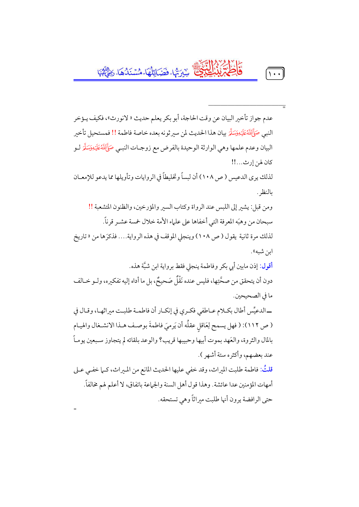 ــ الدعيِّس أطال بكلام عاطفي فكري في إنكار أن فاطمة طلبت ميراثها، وقال في ... (ص ١١٢): (فهل يسمح لِعَاقلٍ عقلُه أن يَرميَ فاطمةَ بوصف هذا الانشغال والهيام بالمال والثروة، والعَهد بموت أبيها وحبيبها قريب؟ والوعد بلقائه لم يتجاوز سبعين يوماً عند بعضهم، وأكثره ستة أشهر).