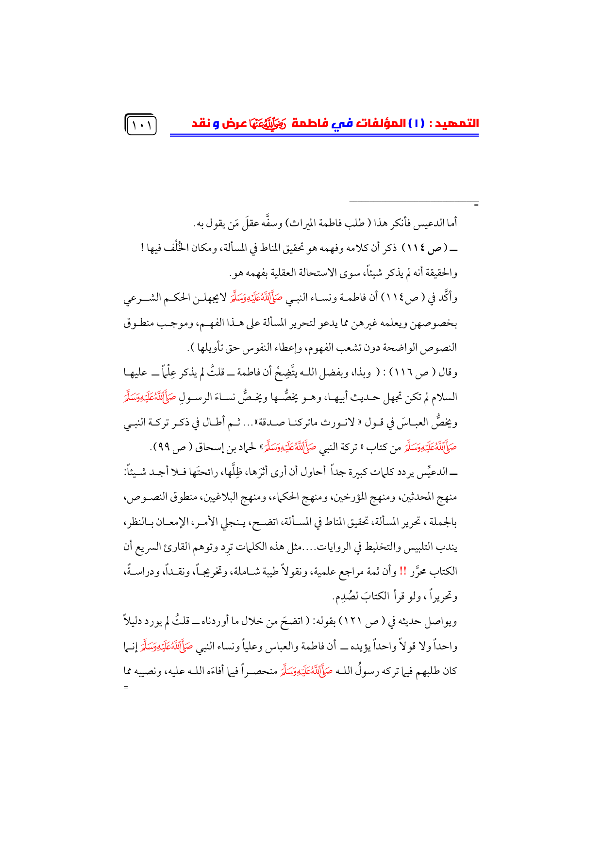 وقال (ص ١١٦): (وبذا، وبفضل الله يتَّضِحْ أن فاطمة ــ قلتُ لم يذكر عِلْماً ــ عليها السلام لم تكن تجهل حديث أبيها، وهو يخصُّها ويخصُّ نساءَ الرسولِ - صلى الله عليه وسلم - ويخصُّ العباسَ في قول «لانورث ماتركنا صدقة» ... ثم أطال في ذكر تركة النبي - صلى الله عليه وسلم - من كتاب «تركة النبي - صلى الله عليه وسلم -» لحماد بن إسحاق (ص ٩٩).