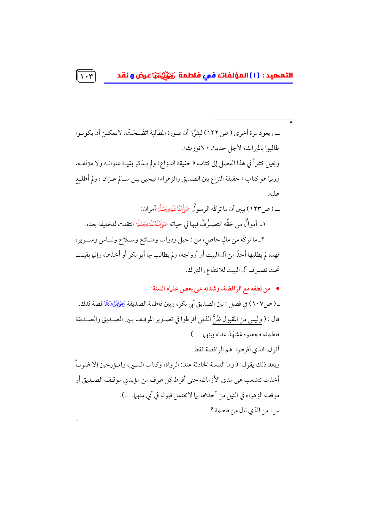 = ــ ويعود مرة أخرى (ص ١٢٢) ليقرِّرَ أن صورة المطالبة اتضَحَتْ، لايمكن أن يكونوا طالبوا بالميراث؛ لأجل حديث «لانورث».