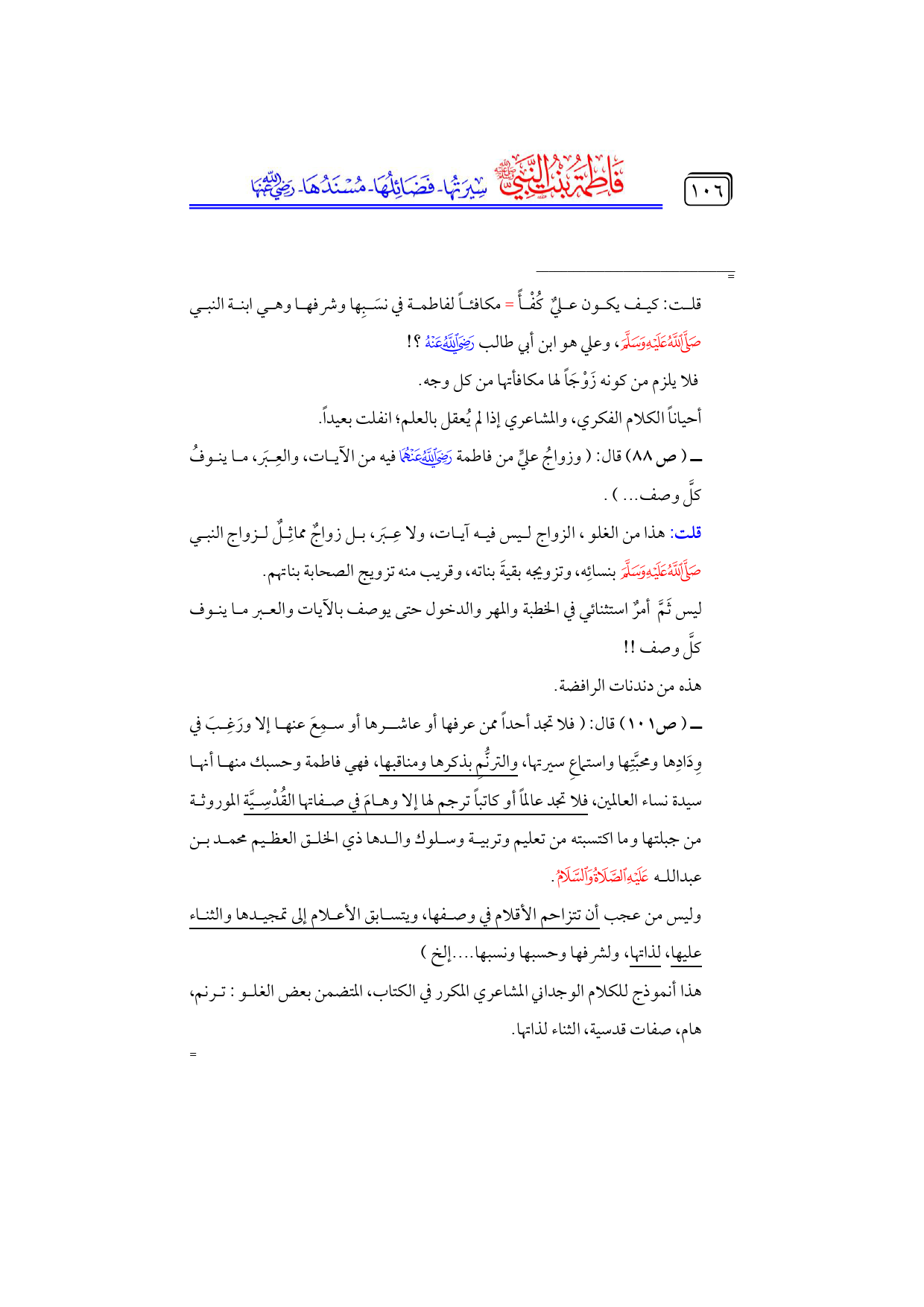 ــ (ص ١٠١) قال: (فلا تجد أحداً ممن عرفها أو عاشرها أو سمِعَ عنها إلا ورَغِبَ في وِدَادِها ومحبَّتِها واستماعِ سيرتها، والترنُّمِ بذكرها ومناقبها، فهي فاطمة وحسبك منها أنها سيدة نساء العالمين، فلا تجد عالماً أو كاتباً ترجم لها إلا وهامَ في صفاتها القُدْسِيَّة الموروثة من جبلتها وما اكتسبته من تعليم وتربية وسلوك والدها ذي الخلق العظيم محمد بن عبدالله - عليه الصلاة والسلام -.