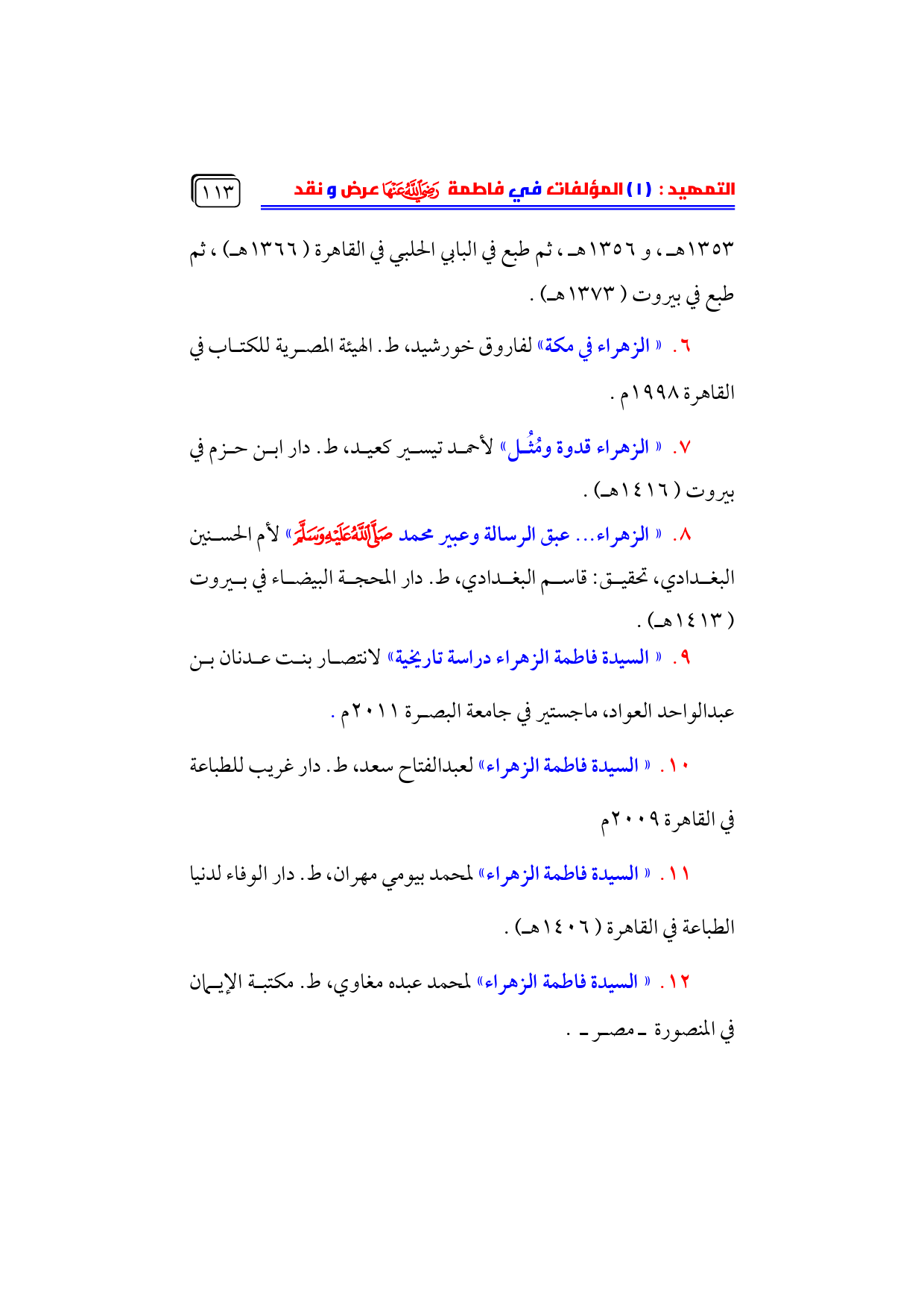 ١٢. «السيدة فاطمة الزهراء» لمحمد عبده مغاوي، ط. مكتبة الإيمان في المنصورة ـ مصر ـ.