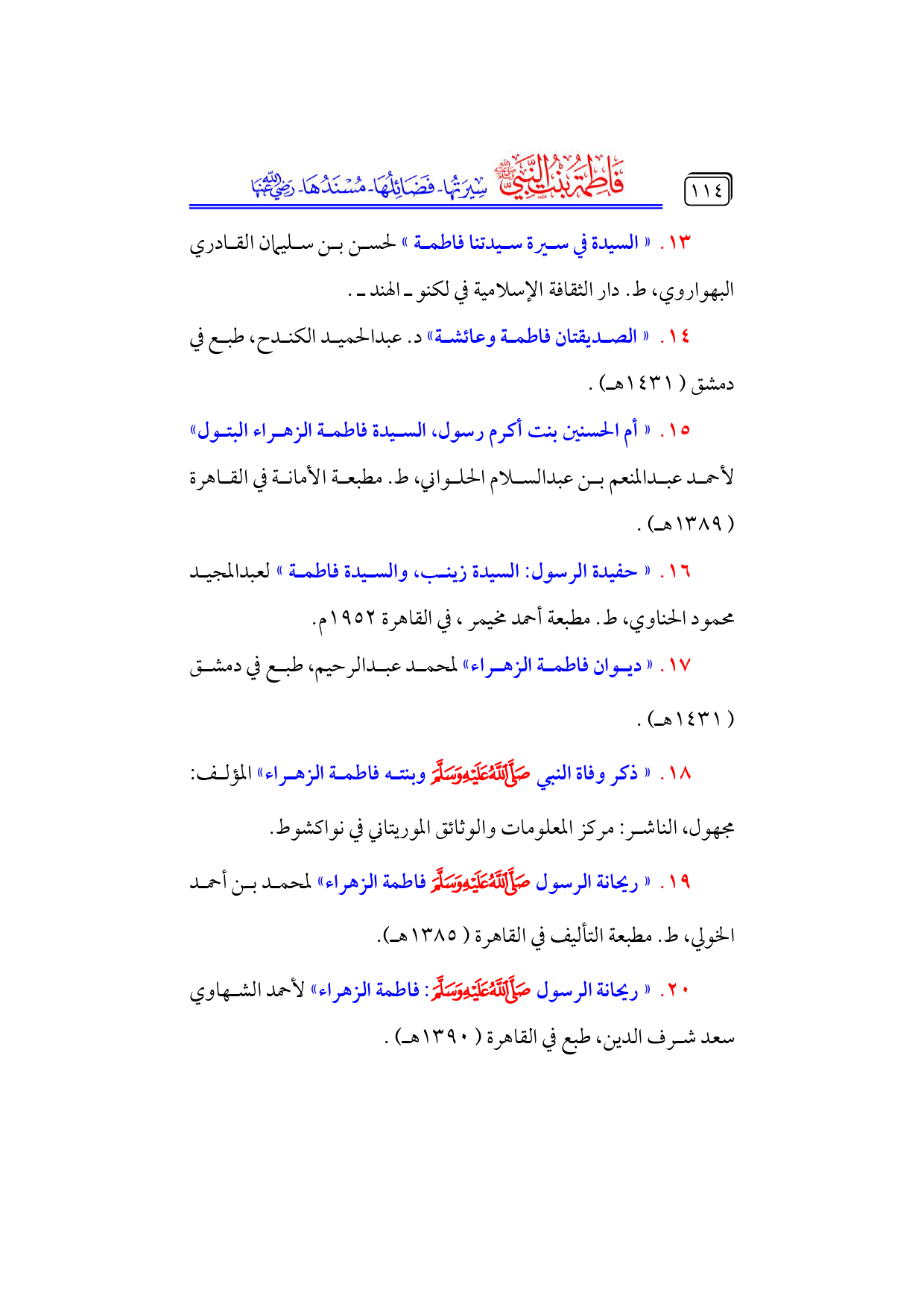 ١٩. «ريحانة الرسول - صلى الله عليه وسلم - فاطمة الزهراء» لمحمد بن أحمد الخولي، ط. مطبعة التأليف في القاهرة (١٣٨٥ هـ).