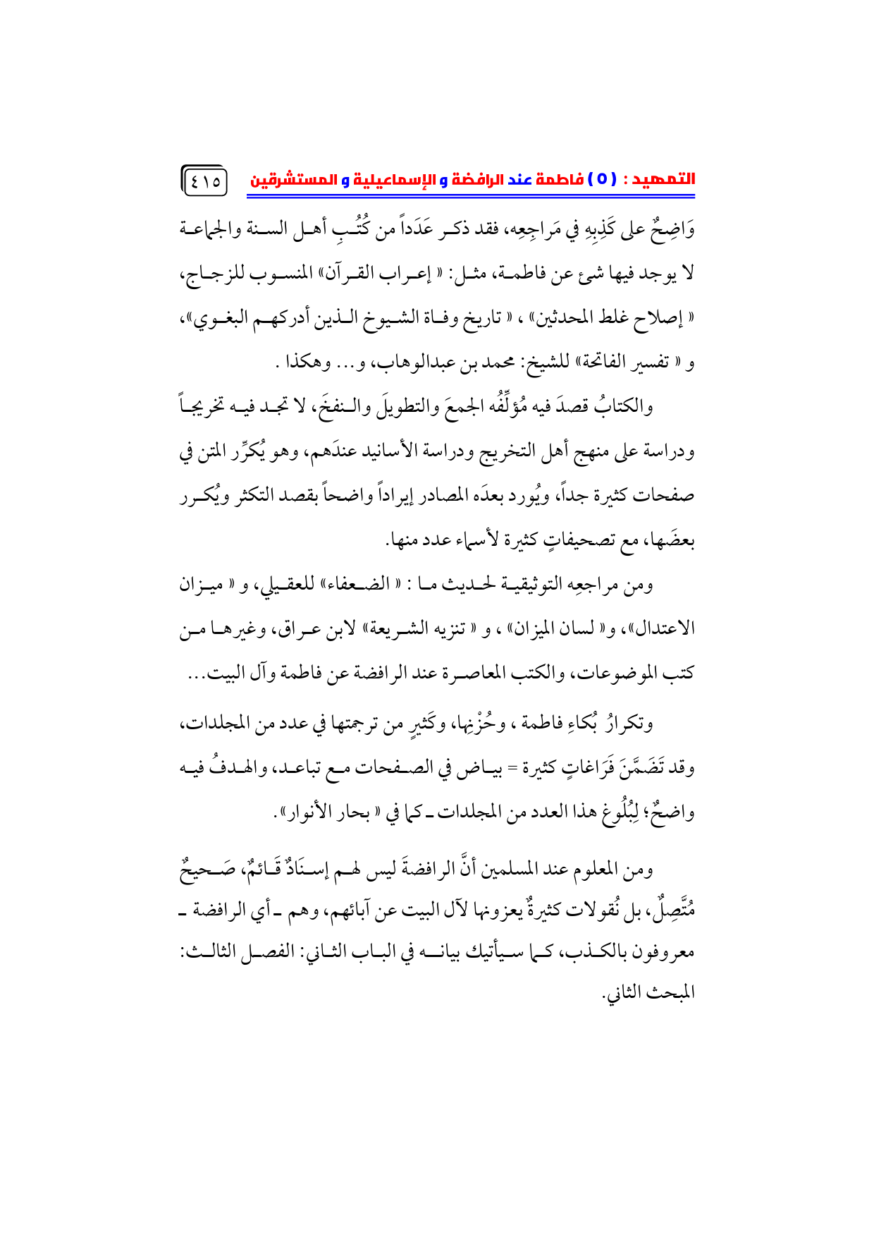 وَاضِحٌ على كَذِبِهِ في مَراجِعِه، فقد ذكر عَدَداً من كُتُبِ أهل السنة والجماعة ... لا يوجد فيها شئ عن فاطمة، مثل: «إعراب القرآن» المنسوب للزجاج، ... «إصلاح غلط المحدثين»، «تاريخ وفاة الشيوخ الذين أدركهم البغوي»، ... و «تفسير الفاتحة» للشيخ: محمد بن عبدالوهاب، و ... وهكذا.