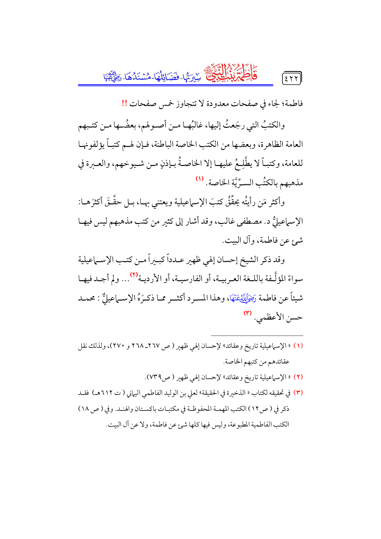 وقد ذكر الشيخ إحسان إلهي ظهير عدداً كبيراً من كتب الإسماعيلية سواءً المؤلَّفة باللغة العربية، أو الفارسية، أو الأردية (¬٢) ... ولم أجد فيها شيئاً عن فاطمة - رضي الله عنها -، وهذا المسرد أكثر مما ذكرَهُ الإسماعيليٌّ: محمد حسن الأعظمي. (¬٣)