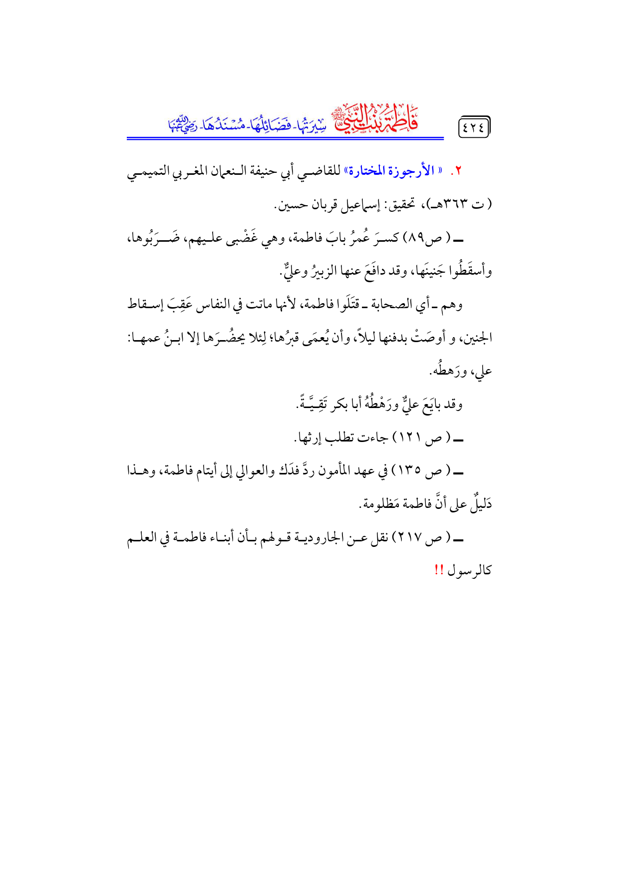 ــ (ص ١٣٥) في عهد المأمون ردَّ فدَك والعوالي إلى أيتام فاطمة، وهذا دَليلٌ على أنَّ فاطمة مَظلومة.