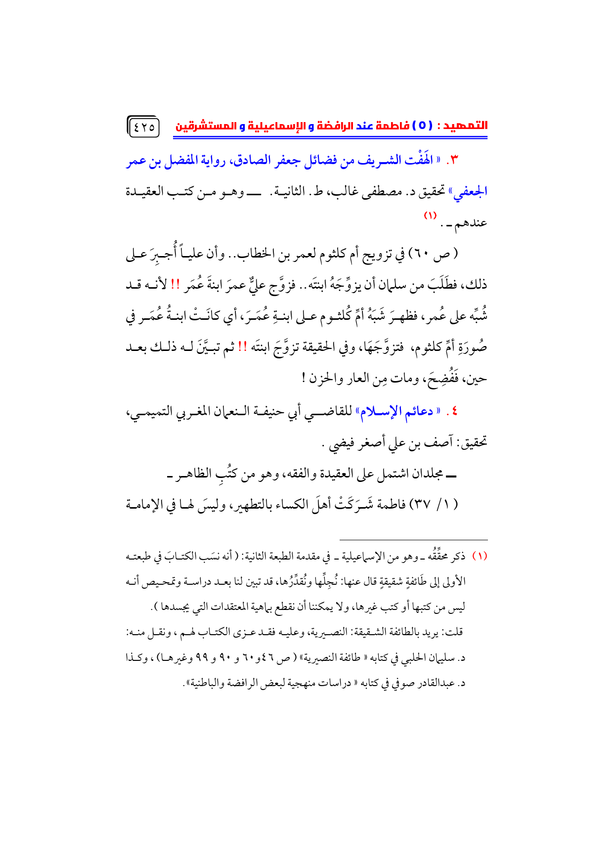 ٣. «الهَفْت الشريف من فضائل جعفر الصادق، رواية المفضل بن عمر الجعفي» تحقيق د. مصطفى غالب، ط. الثانية. ــ وهو من كتب العقيدة عندهم ـ. (¬١)
