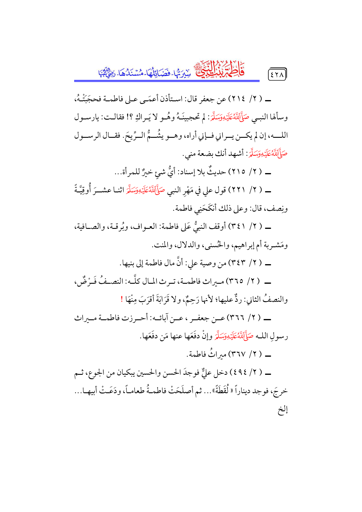 ــ (٢/ ٢١٤) عن جعفر قال: استأذن أعمَى على فاطمة فحجَبَتْهُ، وسألها النبي - صلى الله عليه وسلم -: لم تحجبينَهُ وهُو لا يَراكِ؟ ! فقالت: يارسول الله، إن لم يكن يراني فإني أراه، وهو يشُمُّ الرِّيحَ. فقال الرسول - صلى الله عليه وسلم -: أشهد أنك بضعة مني.