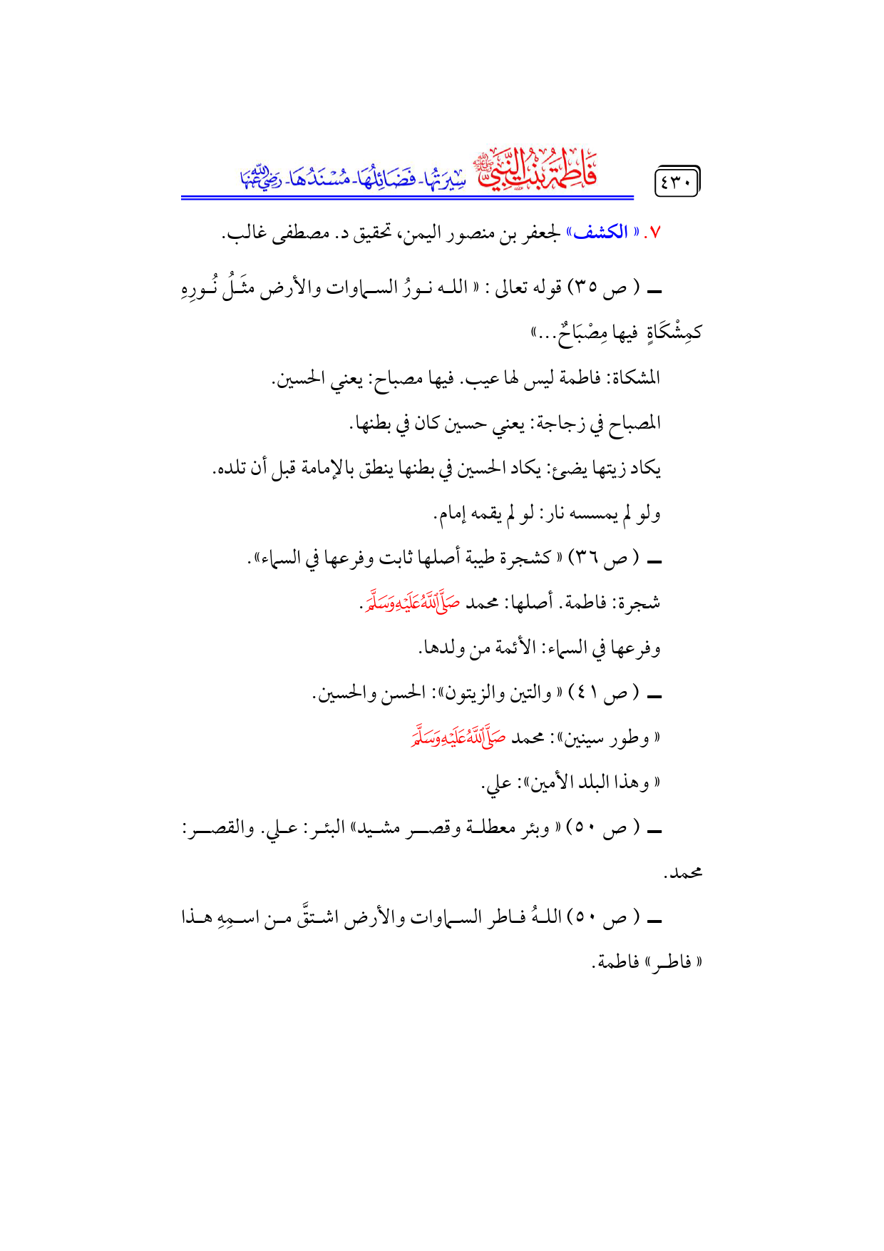 ــ (ص ٥٠) اللهُ فاطر السماوات والأرض اشتقَّ من اسمِهِ هذا ... «فاطر» فاطمة.