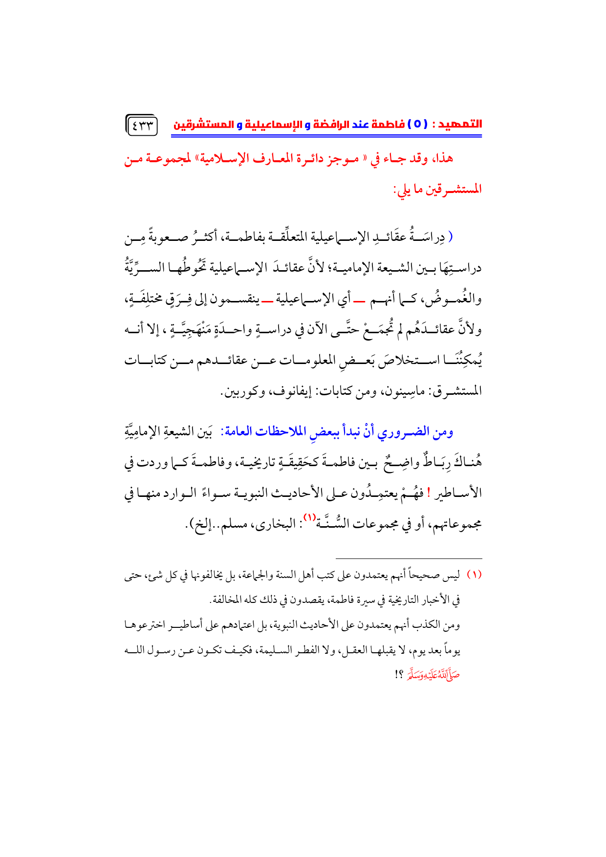 (¬١) ليس صحيحاً أنهم يعتمدون على كتب أهل السنة والجماعة، بل يخالفونها في كل شئ، حتى في الأخبار التاريخية في سيرة فاطمة، يقصدون في ذلك كله المخالفة.