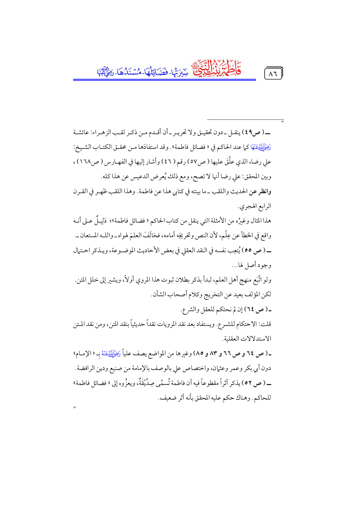 ــ (ص ٥٢) يذكر أثراً مقطوعاً فيه أن فاطمة تُسمَّى صِدِّيْقَةٌ، ويعزُوه إلى «فضائل فاطمة» للحاكم. وهناك حكم عليه المحقق بأنه أثر ضعيف. =