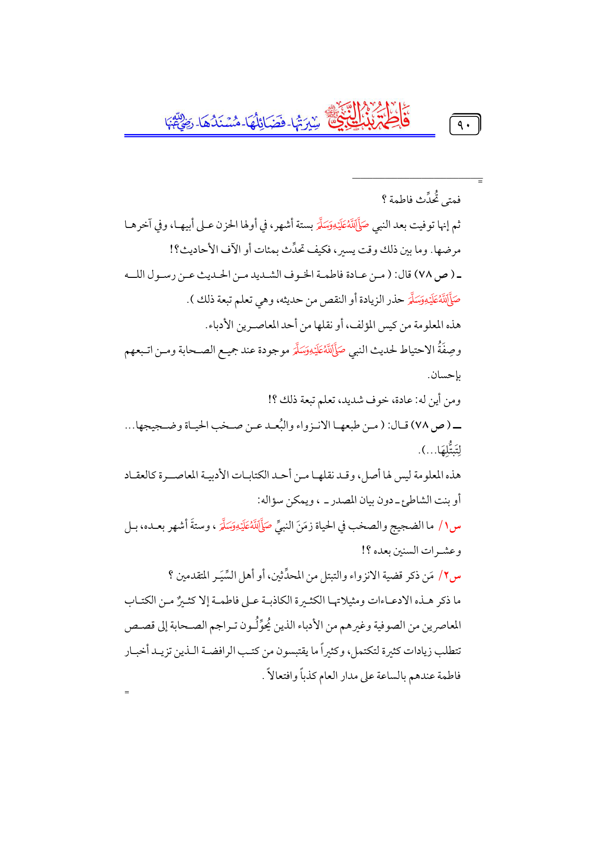 ـ (ص ٧٨) قال: (من عادة فاطمة الخوف الشديد من الحديث عن رسول الله - صلى الله عليه وسلم - حذر الزيادة أو النقص من حديثه، وهي تعلم تبعة ذلك).