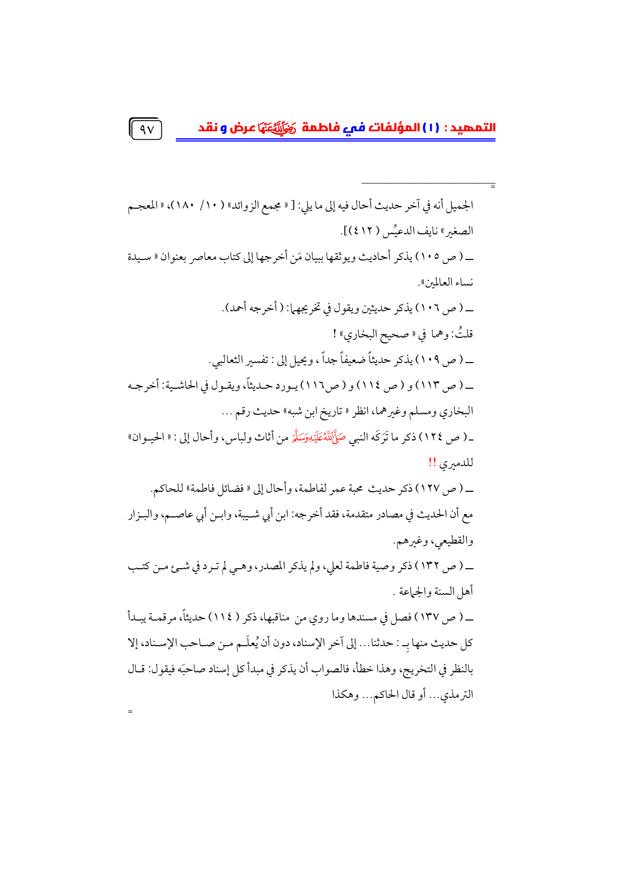 ــ (ص ١٠٥) يذكر أحاديث ويوثقها ببيان مَن أخرجها إلى كتاب معاصر بعنوان «سيدة نساء العالمين».