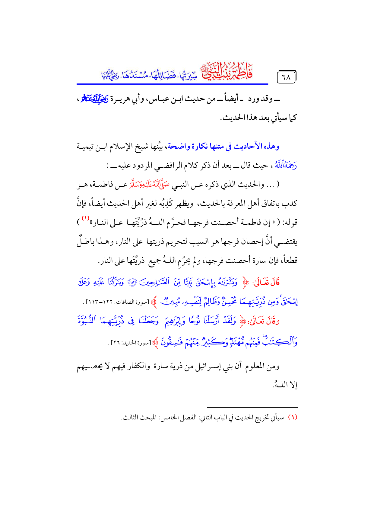 ( ... والحديث الذي ذكره عن النبي - صلى الله عليه وسلم - عن فاطمة، هو كذب باتفاق أهل المعرفة بالحديث، ويظهر كَذِبُه لغير أهل الحديث أيضاً، فإنَّ قوله: («إن فاطمة أحصنت فرجها فحرَّم اللهُ ذرِّيَّتَها على النار» (¬١)) يقتضي أنَّ إحصان فرجها هو السبب لتحريم ذريتها على النار، وهذا باطلٌ قطعاً، فإن سارة أحصنت فرجها، ولم يحرِّمِ اللهُ جميع ذريَّتَها على النار.