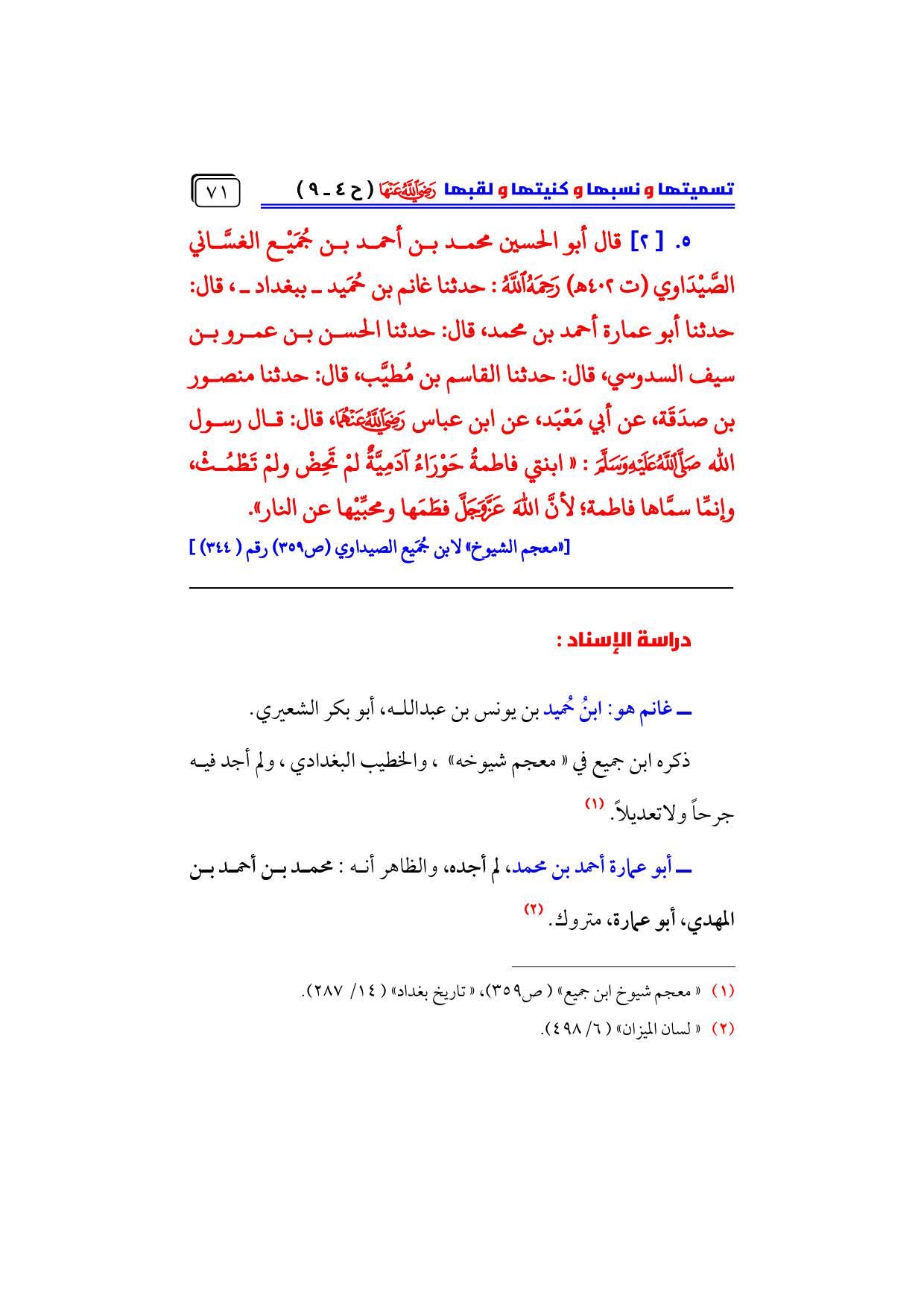 ٥. [٢] قال أبو الحسين محمد بن أحمد بن جُمَيْع الغسَّاني الصَّيْدَاوي (ت ٤٠٢ هـ) - رحمه الله -: حدثنا غانم بن حُمَيد ـ ببغداد ـ، قال: حدثنا أبو عمارة أحمد بن محمد، قال: حدثنا الحسن بن عمرو بن سيف السدوسي، قال: حدثنا القاسم بن مُطيَّب، قال: حدثنا منصور بن صدَقَة، عن أبي مَعْبَد، عن ابن عباس - رضي الله عنهما -، قال: قال رسول الله - صلى الله عليه وسلم -: «ابنتي فاطمةُ حَوْرَاءُ آدَمِيَّةٌ لمْ تَحِضْ ولمْ تَطْمُثْ، وإنمِّا سمَّاها فاطمة؛ لأنَّ اللهَ - عز وجل - فطَمَها ومحبِّيْها عن النار».