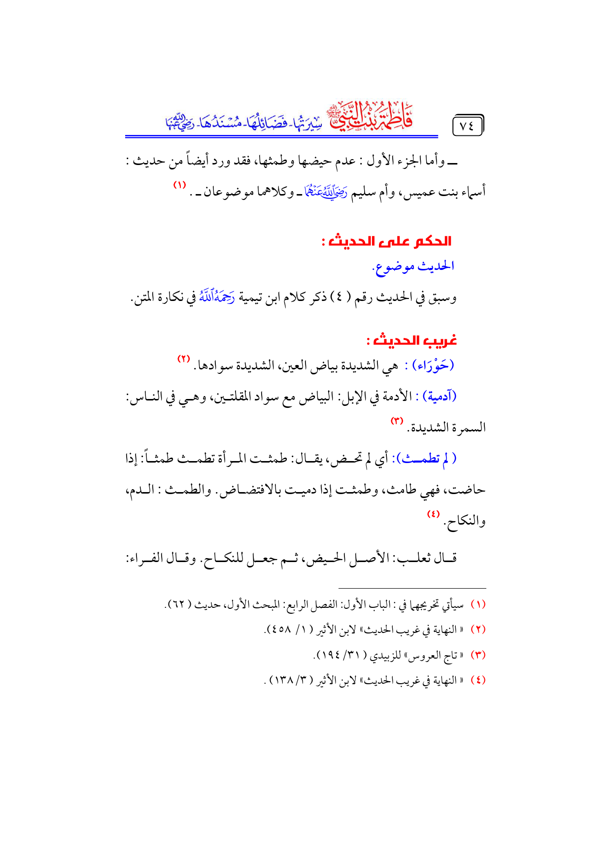 ــ وأما الجزء الأول: عدم حيضها وطمثها، فقد ورد أيضاً من حديث: أسماء بنت عميس، وأم سليم - رضي الله عنهما - ـ وكلاهما موضوعان ـ. (¬١)