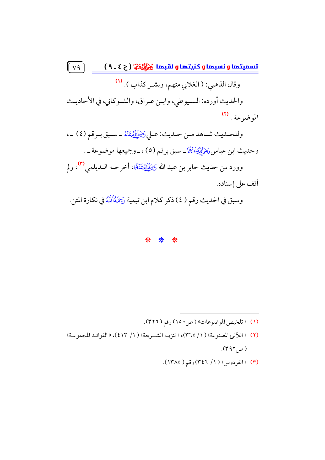 والحديث أورده: السيوطي، وابن عراق، والشوكاني، في الأحاديث الموضوعة. (¬٢)