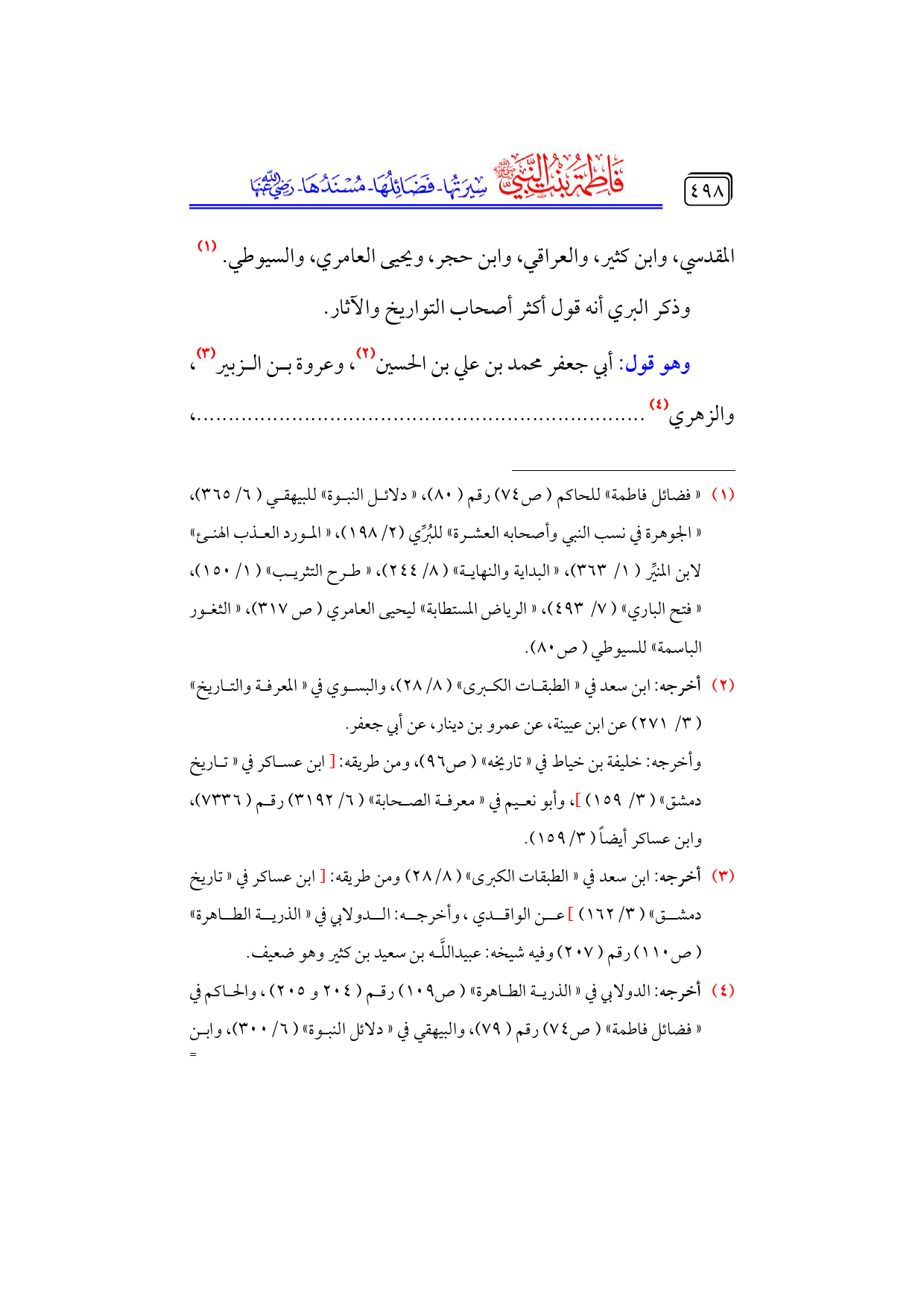 (¬١) «فضائل فاطمة» للحاكم (ص ٧٤) رقم (٨٠)، «دلائل النبوة» للبيهقي (٦/ ٣٦٥)، ... «الجوهرة في نسب النبي وأصحابه العشرة» للبُرِّي (٢/ ١٩٨)، «المورد العذب الهنئ» لابن المنيِّر (١/ ٣٦٣)، «البداية والنهاية» (٨/ ٢٤٤)، «طرح التثريب» (١/ ١٥٠)، ... «فتح الباري» (٧/ ٤٩٣)، «الرياض المستطابة» ليحيى العامري (ص ٣١٧)، «الثغور الباسمة» للسيوطي (ص ٨٠).