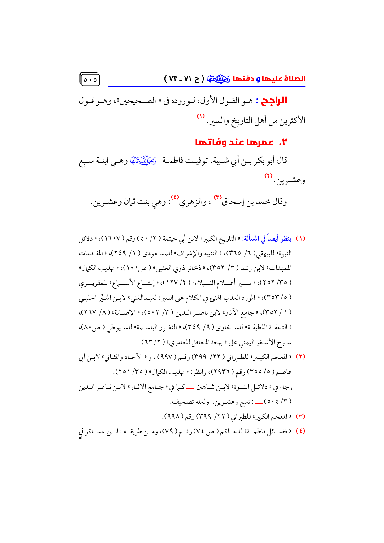 (¬١) ينظر أيضاً في المسألة: «التاريخ الكبير» لابن أبي خيثمة (٢/ ٤٠) رقم (١٦٠٧)، «دلائل النبوة» للبيهقي (٦/ ٣٦٥)، «التنبيه والإشراف» للمسعودي (١/ ٢٤٩)، «المقدمات الممهدات» لابن رشد (٣/ ٣٥٢)، «ذخائر ذوي العقبى» (ص ١٠١)، «تهذيب الكمال» (٣٥/ ٢٥٢)، «سير أعلام النبلاء» (٢/ ١٢٧)، «إمتاع الأسماع» للمقريزي ... (٥/ ٣٥٣)، «المورد العذب الهنئ في الكلام على السيرة لعبدالغني» لابن المنيِّر الحلبي ... (١/ ٣٥٢)، «جامع الآثار» لابن ناصر الدين (٣/ ٥٠٢)، «الإصابة» (٨/ ٢٦٧)، ... «التحفة اللطيفة» للسخاوي (٩/ ٣٤٩)، «الثغور الباسمة» للسيوطي (ص ٨٠)، شرح الأشخر اليمني على «بهجة المحافل للعامري» (٢/ ٦٣).