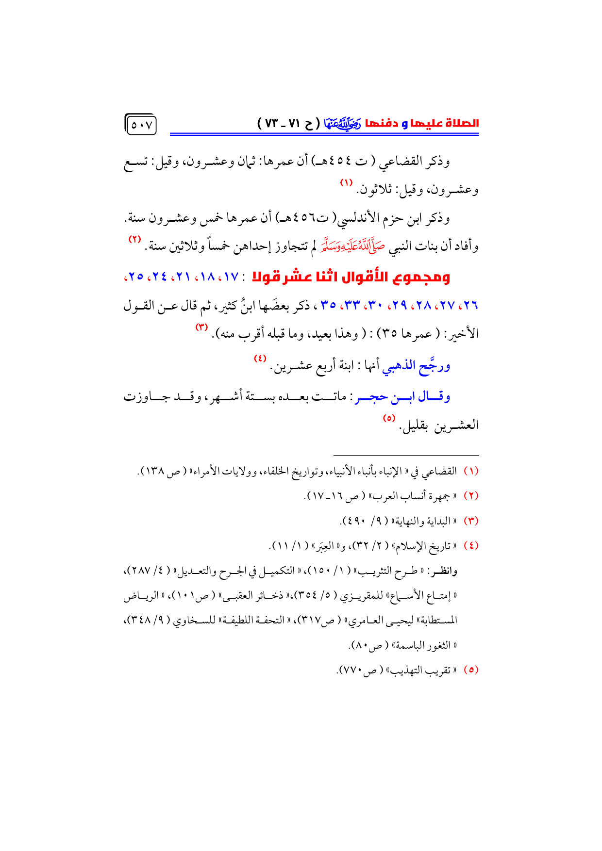 ومجموع الأقوال اثنا عشر قولا: ١٧، ١٨، ٢١، ٢٤، ٢٥، ٢٦، ٢٧، ٢٨، ٢٩، ٣٠، ٣٣، ٣٥، ذكر بعضَها ابنُ كثير، ثم قال عن القول الأخير: (عمرها ٣٥): (وهذا بعيد، وما قبله أقرب منه). (¬٣)