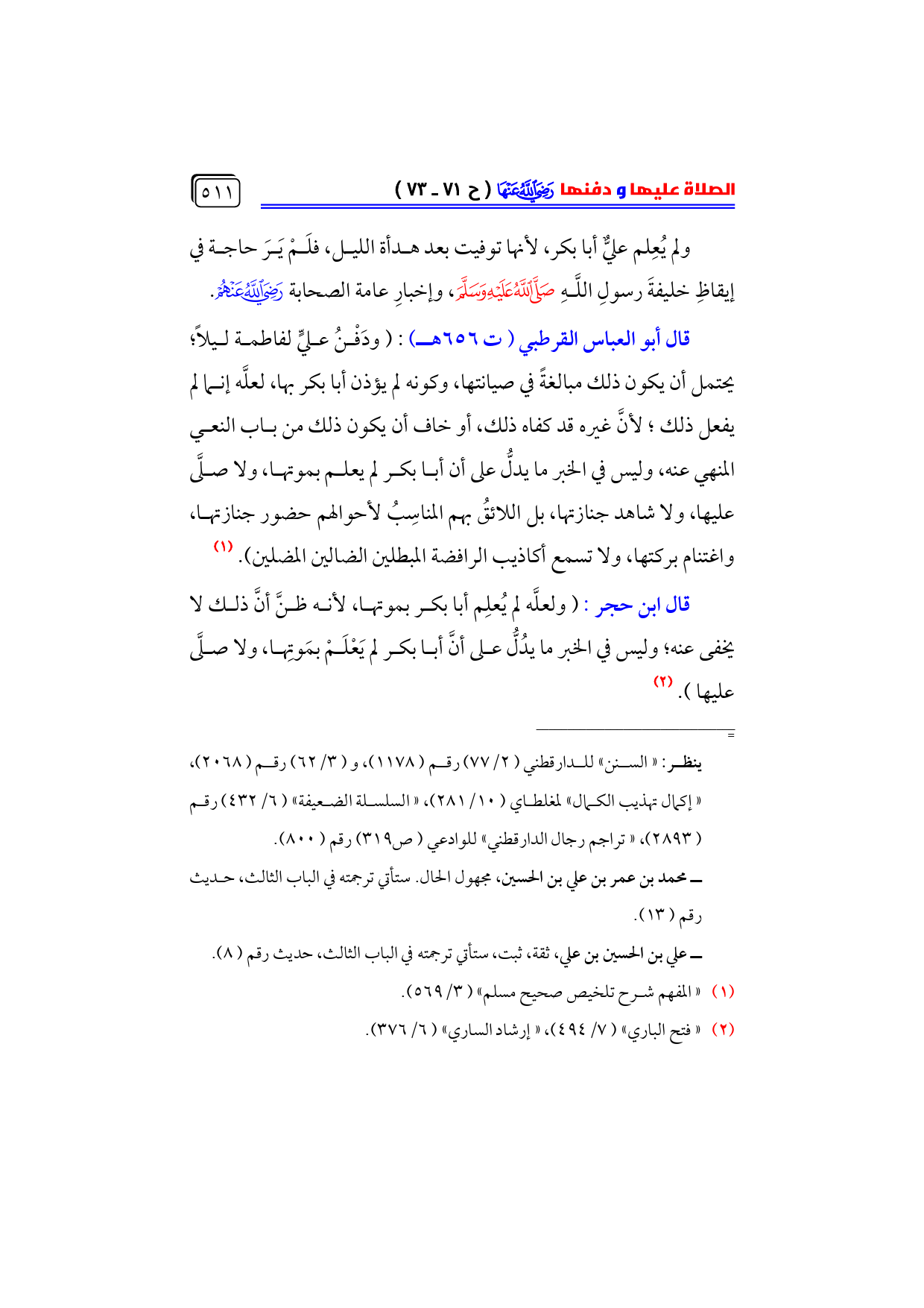 قال أبو العباس القرطبي (ت ٦٥٦ هـ): (ودَفْنُ عليٍّ لفاطمة ليلاً؛ يحتمل أن يكون ذلك مبالغةً في صيانتها، وكونه لم يؤذن أبا بكر بها، لعلَّه إنما لم يفعل ذلك؛ لأنَّ غيره قد كفاه ذلك، أو خاف أن يكون ذلك من باب النعي المنهي عنه، وليس في الخبر ما يدلُّ على أن أبا بكر لم يعلم بموتها، ولا صلَّى عليها، ولا شاهد جنازتها، بل اللائقُ بهم المناسِبُ لأحوالهم حضور جنازتها، واغتنام بركتها، ولا تسمع أكاذيب