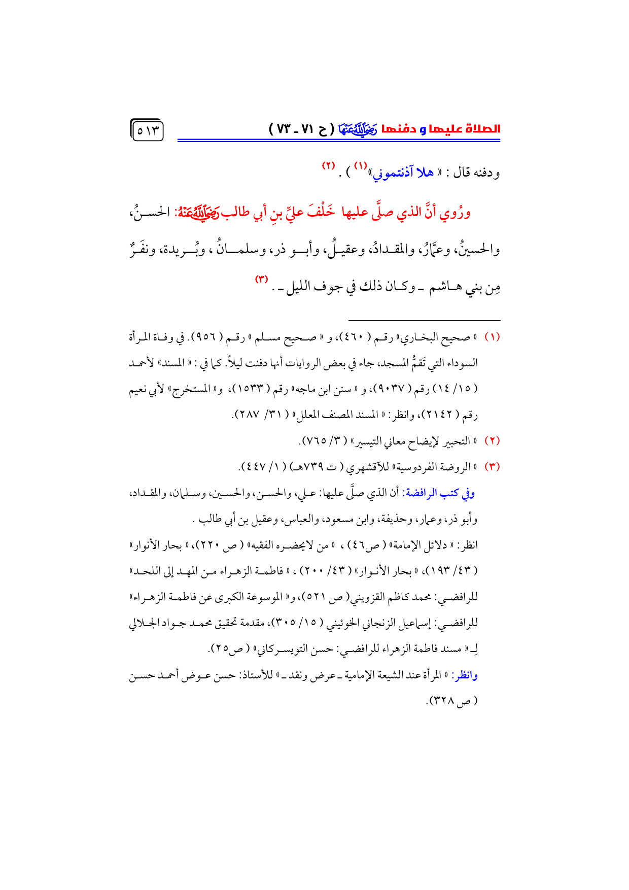 ورُوي أنَّ الذي صلَّى عليها خَلْفَ عليِّ بنِ أبي طالب - رضي الله عنه -: الحسنُ، والحسينُ، وعمَّارُ، والمقدادُ، وعقيلُ، وأبو ذر، وسلمانُ، وبُريدة، ونفَرٌ مِن بني هاشم ـ وكان ذلك في جوف الليل ـ. (¬٣)