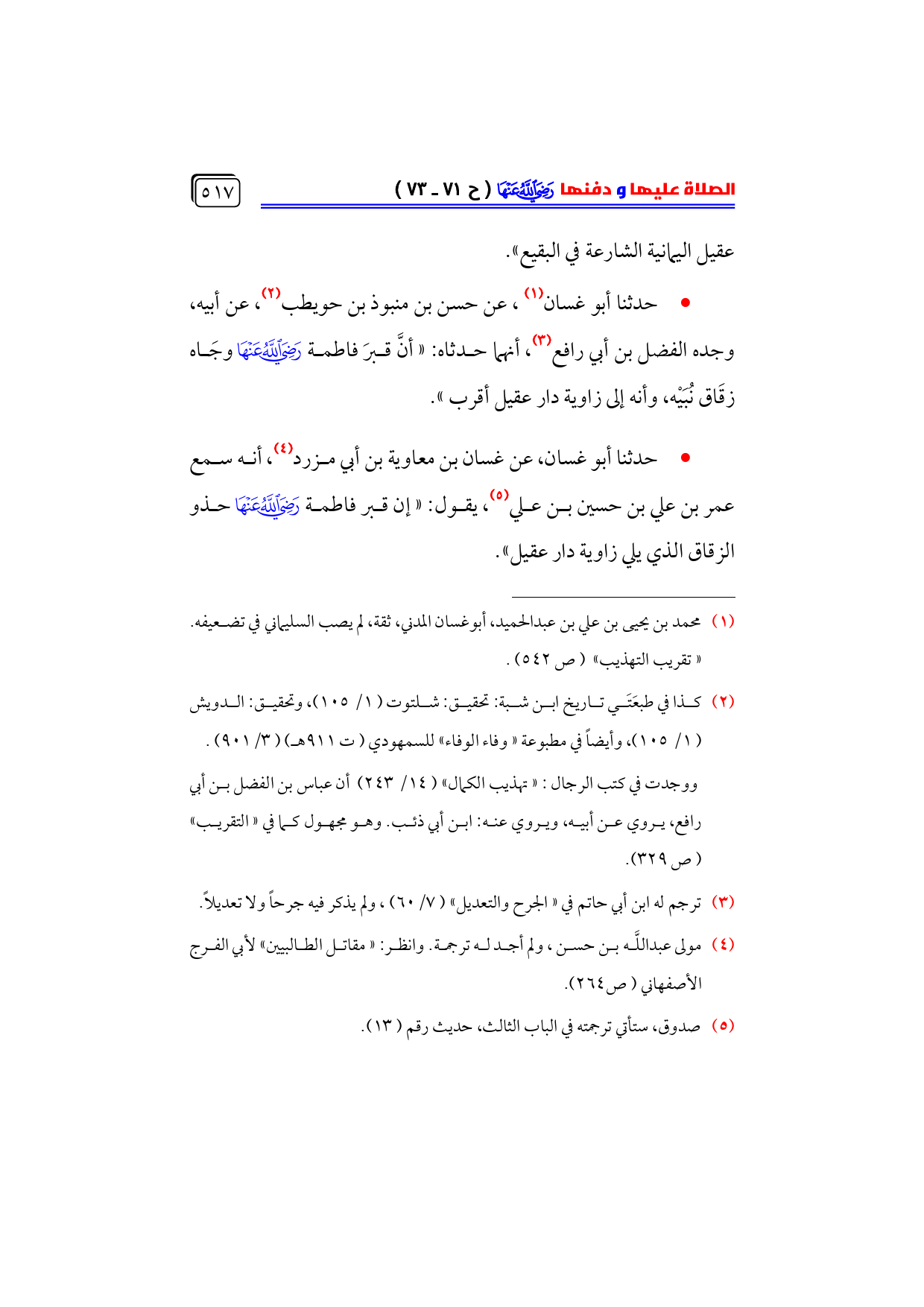 - حدثنا أبو غسان، عن غسان بن معاوية بن أبي مزرد (¬٤)، أنه سمع عمر بن علي بن حسين بن علي (¬٥)، يقول: «إن قبر فاطمة - رضي الله عنها - حذو الزقاق الذي يلي زاوية دار عقيل».