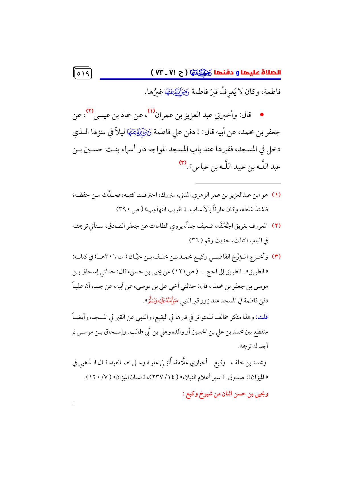 (¬٣) وأخرج المؤرِّخ القاضي وكيع محمد بن خلف بن حيَّان (ت ٣٠٦ هـ) في كتابه: ... «الطريق» ـ الطريق إلى الحج ـ (ص ١٢١) عن يحيى بن حسن، قال: حدثني إسحاق بن موسى بن جعفر بن محمد، قال: حدثني أخي علي بن موسى، عن أبيه، عن جده أن علياً دفن فاطمة في المسجد عند زور قبر النبي - صلى الله عليه وسلم -».