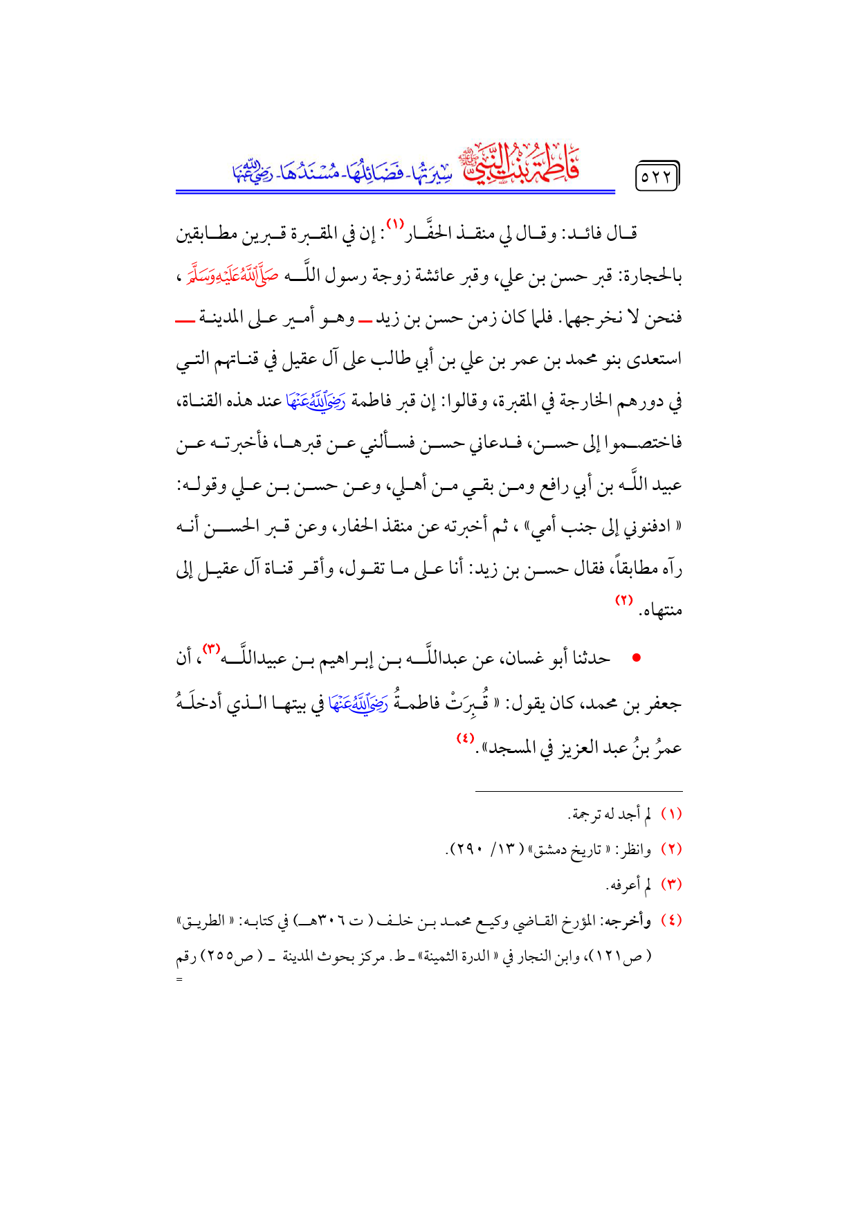 قال فائد: وقال لي منقذ الحفَّار (¬١): إن في المقبرة قبرين مطابقين بالحجارة: قبر حسن بن علي، وقبر عائشة زوجة رسول اللَّه - صلى الله عليه وسلم -، فنحن لا نخرجهما. فلما كان زمن حسن بن زيد ــ وهو أمير على المدينة ــ استعدى بنو محمد بن عمر بن علي بن أبي طالب على آل عقيل في قناتهم التي في دورهم الخارجة في المقبرة، وقالوا: إن قبر فاطمة - رضي الله عنها - عند هذه القناة، فاختصموا إلى حسن، فدعاني حسن فسألني عن قبرها، فأخبرته عن ... عبيد اللَّه بن أبي رافع ومن بقي من أهلي، وعن حسن بن علي وقوله: ... «ادفنوني إلى جنب أمي»، ثم أخبرته عن منقذ الحفار، وعن قبر الحسن أنه رآه مطابقاً، فقال حسن بن زيد: أنا على ما تقول، وأقر قناة آل عقيل إلى منتهاه. (¬٢)