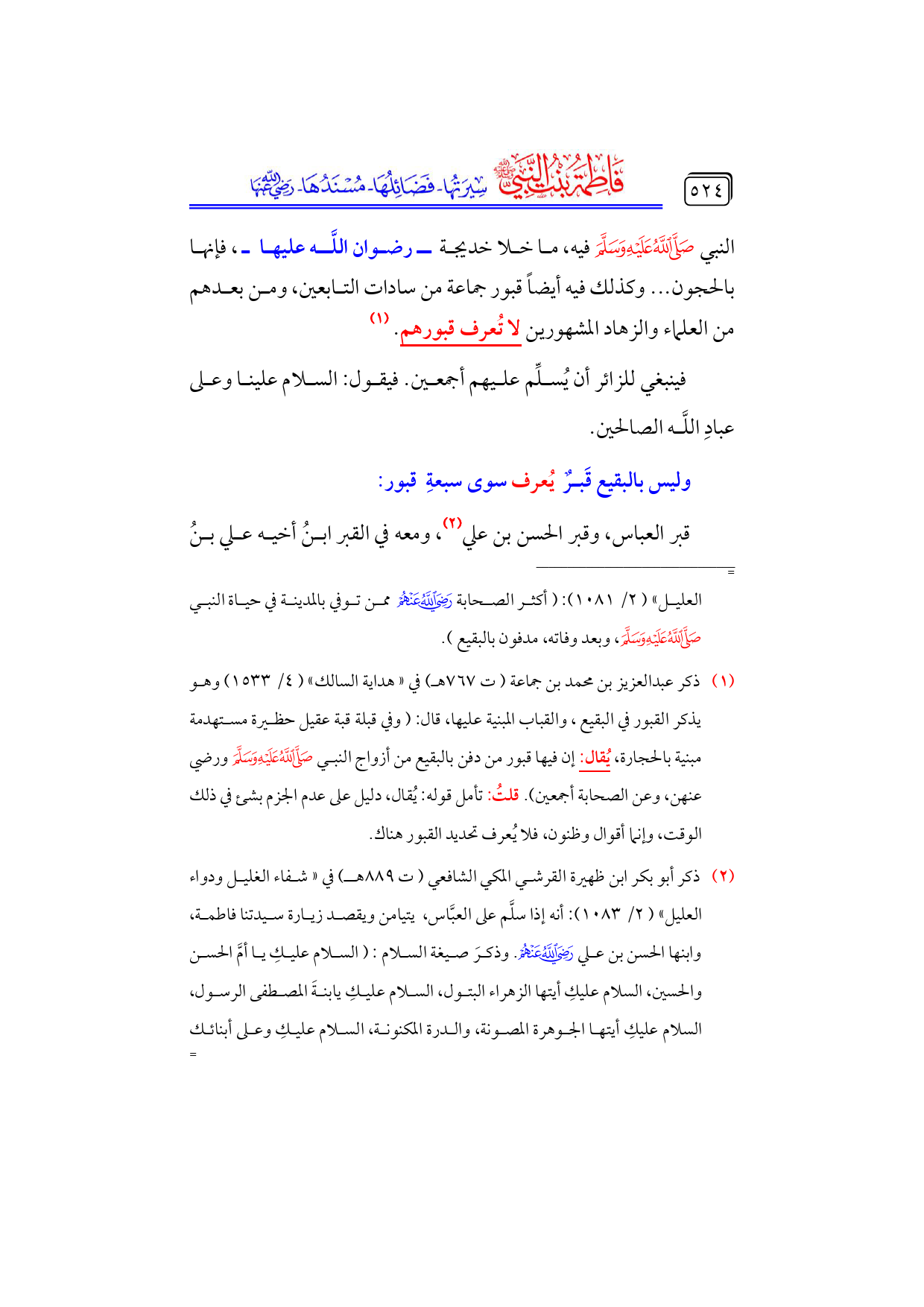 (¬٢) ذكر أبو بكر ابن ظهيرة القرشي المكي الشافعي (ت ٨٨٩ هـ) في «شفاء الغليل ودواء العليل» (٢/ ١٠٨٣): أنه إذا سلَّم على العبَّاس، يتيامن ويقصد زيارة سيدتنا فاطمة، وابنها الحسن بن علي - رضي الله عنهم -. وذكرَ صيغة السلام: (السلام عليكِ يا أمَّ الحسن والحسين، السلام عليكِ أيتها الزهراء البتول، السلام عليكِ يابنةَ المصطفى الرسول، السلام عليكِ أيتها الجوهرة المصونة، والدرة المكنونة، السلام عليكِ وعلى أبنائك =