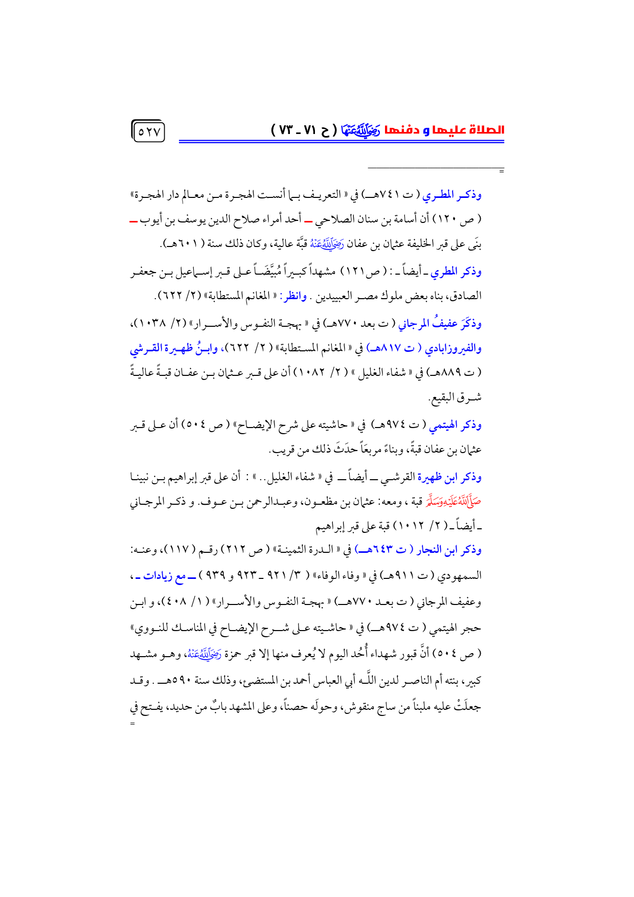 وذكر ابن النجار (ت ٦٤٣ هـ) في «الدرة الثمينة» (ص ٢١٢) رقم (١١٧)، وعنه: السمهودي (ت ٩١١ هـ) في «وفاء الوفاء» (٣/ ٩٢١ ـ ٩٢٣ و ٩٣٩) ــ مع زيادات ـ، وعفيف المرجاني (ت بعد ٧٧٠ هـ) «بهجة النفوس والأسرار» (١/ ٤٠٨)، وابن حجر الهيتمي (ت ٩٧٤ هـ) في «حاشيته على شرح الإيضاح في المناسك للنووي» ... (ص ٥٠٤) أنَّ قبور شهداء أُحُد اليوم لا يُعرف منها إلا قبر حمزة - رضي الله عنه -، وهو مشهد كبير، بنته أم الناصر لدين اللَّه أبي العباس أحمد بن المستضئ، وذلك سنة ٥٩٠ هـ. وقد جعلَتْ عليه ملبناً من ساج منقوش، وحولَه حصناً، وعلى المشهد بابٌ من حديد، يفتح في =