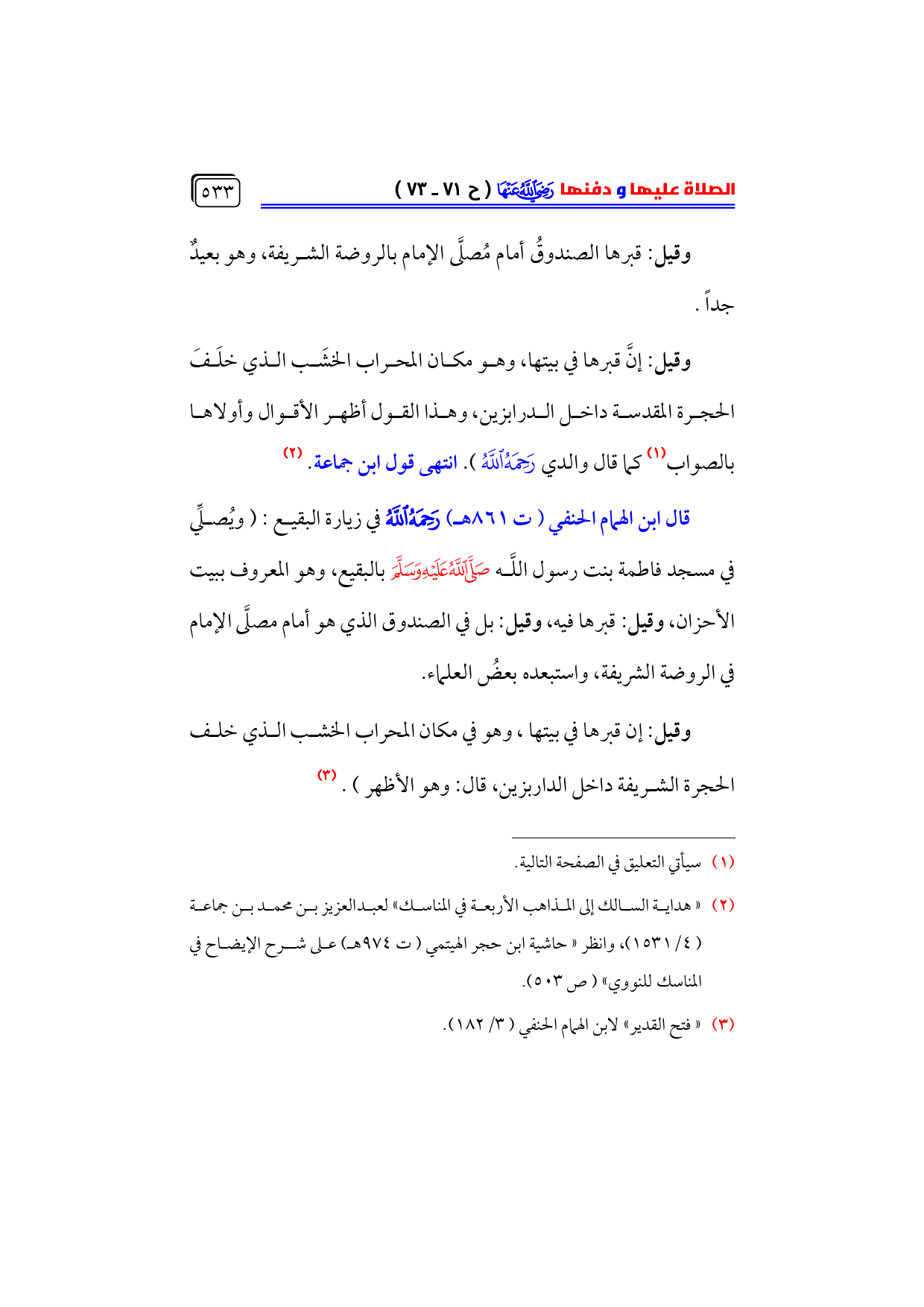 وقيل: إنَّ قبرها في بيتها، وهو مكان المحراب الخشَب الذي خلَفَ الحجرة المقدسة داخل الدرابزين، وهذا القول أظهر الأقوال وأولاها بالصواب (¬١) كما قال والدي - رحمه الله -). انتهى قول ابن جماعة. (¬٢)