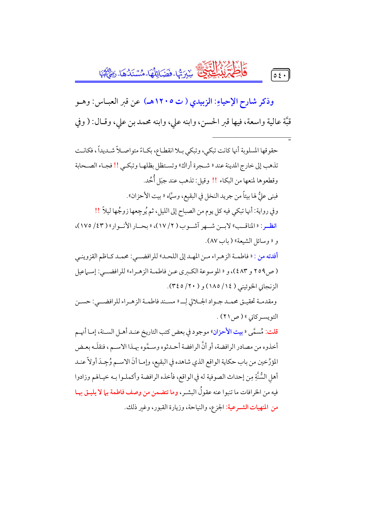قلت: مُسمَّى «بيت الأحزان» موجود في بعض كتب التاريخ عند أهل السنة، إما أنهم أخذوه من مصادر الرافضة، أو أنَّ الرافضة أحدثوه وسمَّوه بهذا الاسم، فنقلَه بعض المؤرِّخين من باب حكاية الواقع الذي شاهده في البقيع، وإما أنَ الاسم وُجِدَ أولاً عند أهلِ السُّنَّةِ مِن إحداث الصوفية له في الواقع، فأخذه الرافضة وأكملوا به خيالهم وزادوا فيه من الخرافات ما تنبوا عنه عقولُ البشر، وما تتضمن من وصف فاطمة بما لا يليق بها من المنهيات الشرعية: الجزع، والنياحة، وزيارة القبور، وغير ذلك.