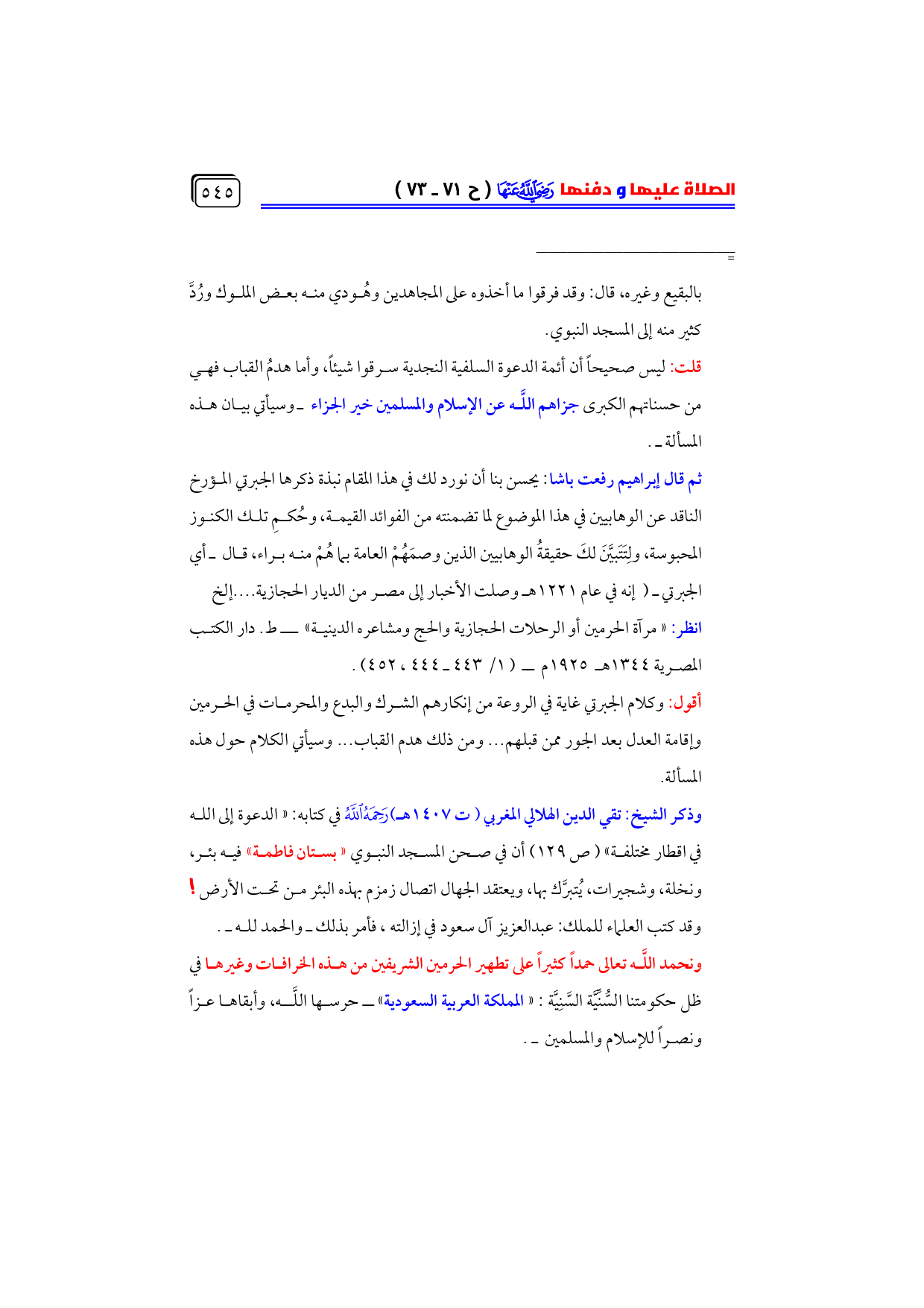 ونحمد اللَّه تعالى حمداً كثيراً على تطهير الحرمين الشريفين من هذه الخرافات وغيرها في ظل حكومتنا السُّنِّيَّة السَّنِيَّة: «المملكة العربية السعودية» ـ حرسها اللَّه، وأبقاها عزاً ونصراً للإسلام والمسلمين ـ.