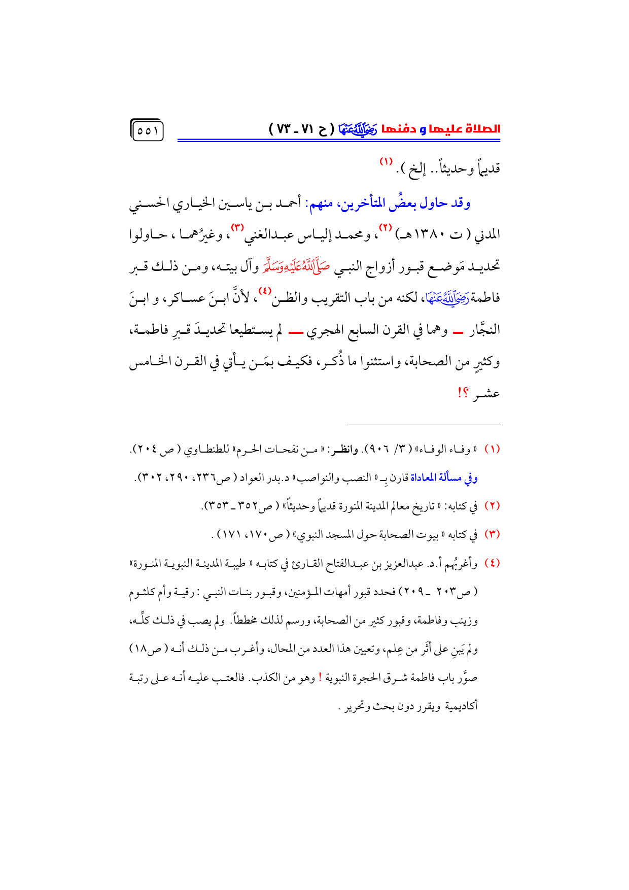 وقد حاول بعضُ المتأخرين، منهم: أحمد بن ياسين الخياري الحسني المدني (ت ١٣٨٠ هـ) (¬٢)، ومحمد إلياس عبدالغني (¬٣)، وغيرُهما، حاولوا تحديد مَوضع قبور أزواج النبي - صلى الله عليه وسلم - وآل بيته، ومن ذلك قبر فاطمة - رضي الله عنها -، لكنه من باب التقريب والظن (¬٤)، لأنَّ ابنَ عساكر، وابنَ النجَّار ــ وهما في القرن السابع الهجري ــ لم يستطيعا تحديدَ قبرِ فاطمة، وكثيرٍ من الصحابة، واستثنوا ما ذُكر، فكيف بمَن يأتي في القرن الخامس عشر؟ !