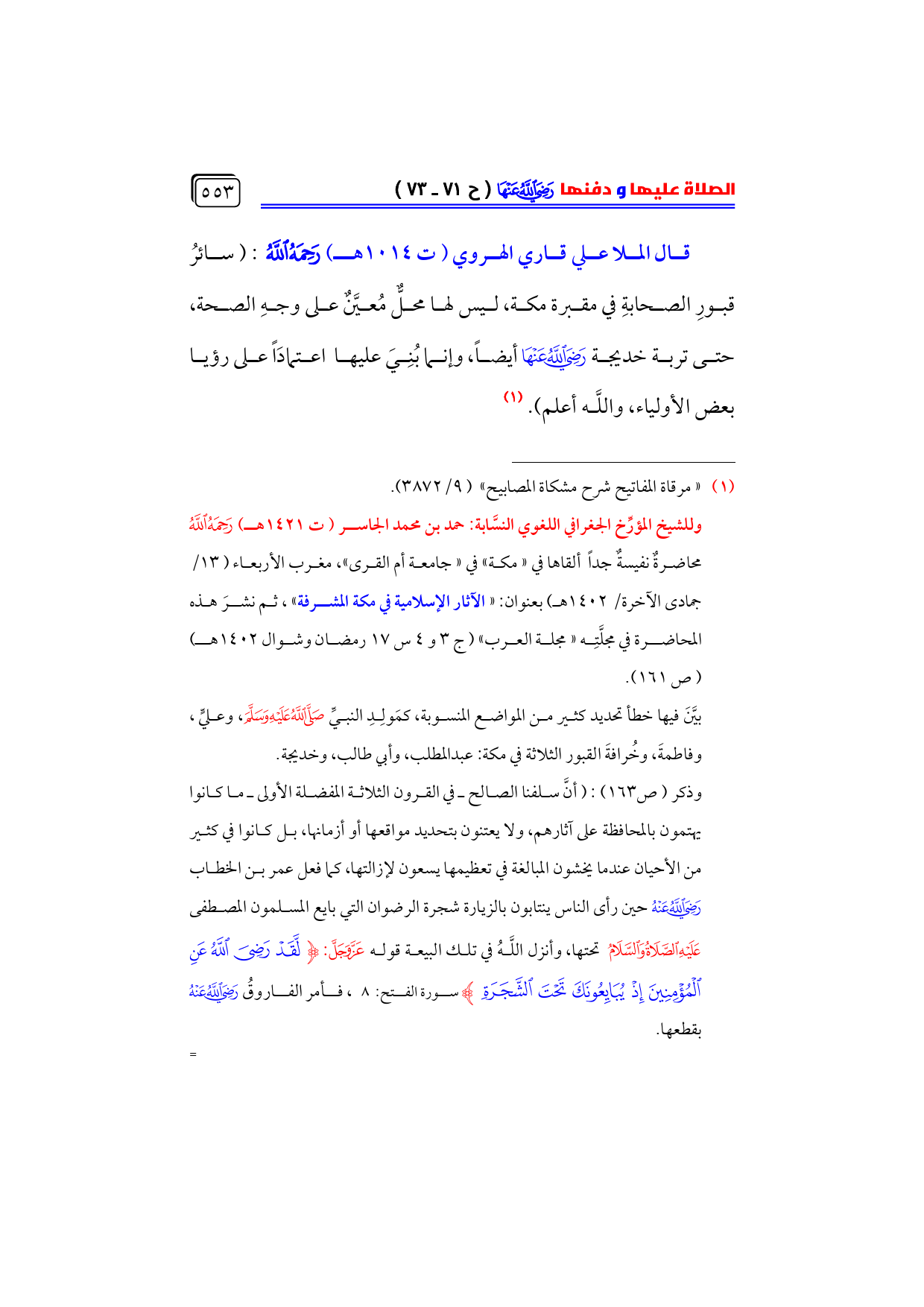 قال الملا علي قاري الهروي (ت ١٠١٤ هـ) - رحمه الله -: (سائرُ قبورِ الصحابةِ في مقبرة مكة، ليس لها محلٌّ مُعيَّنٌ على وجهِ الصحة، حتى تربة خديجة - رضي الله عنها - أيضاً، وإنما بُنِيَ عليها اعتمادَاً على رؤيا بعض الأولياء، واللَّه أعلم). (¬١)
