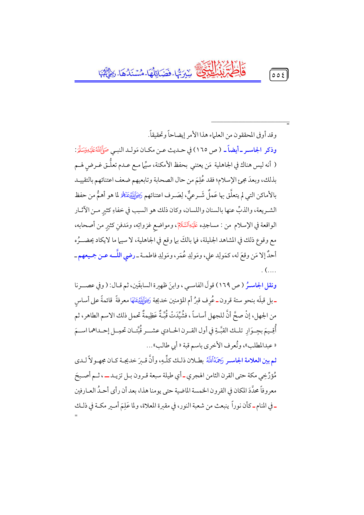 وذكر الجاسر ـ أيضاً ـ (ص ١٦٥) في حديث عن مكان مَولد النبي - صلى الله عليه وسلم -: ... (أنه ليس هناك في الجاهلية مَن يعتني بحفظ الأمكنة، سيِّما مع عدم تعلُّق غرضٍ لهم بذلك، وبعدَ مجئ الإسلام؛ فقد عُلِمَ من حال الصحابة وتابعيهم ضعف اعتنائهم بالتقييد بالأماكن التي لم يتعلَّق بها عَملٌ شَرعيٌّ، لِصَرف اعتنائهم - رضي الله عنهم - لما هو أهمُّ من حفظ الشريعة، والذبِّ عنها بالسنان واللسان، وكان ذلك هو السبب في خفاءِ كثيرٍ من الآثار الواقعة في الإسلام من: مساجدِه - عليه السلام -، ومواضعِ غزواتِه، ومَدفنِ كثيرٍ من أصحابه، مع وقوع ذلك في المشاهد الجليلة، فما بالكَ بما وقع في الجاهلية، لا سيما ما لايكاد يحضرُه أحدٌ إلا مَن وقعَ له، كمَولِد علي، ومَولِدِ عُمَر، ومَولِدِ فاطمة ـ رضي اللَّه عن جميعهم ـ .... ).