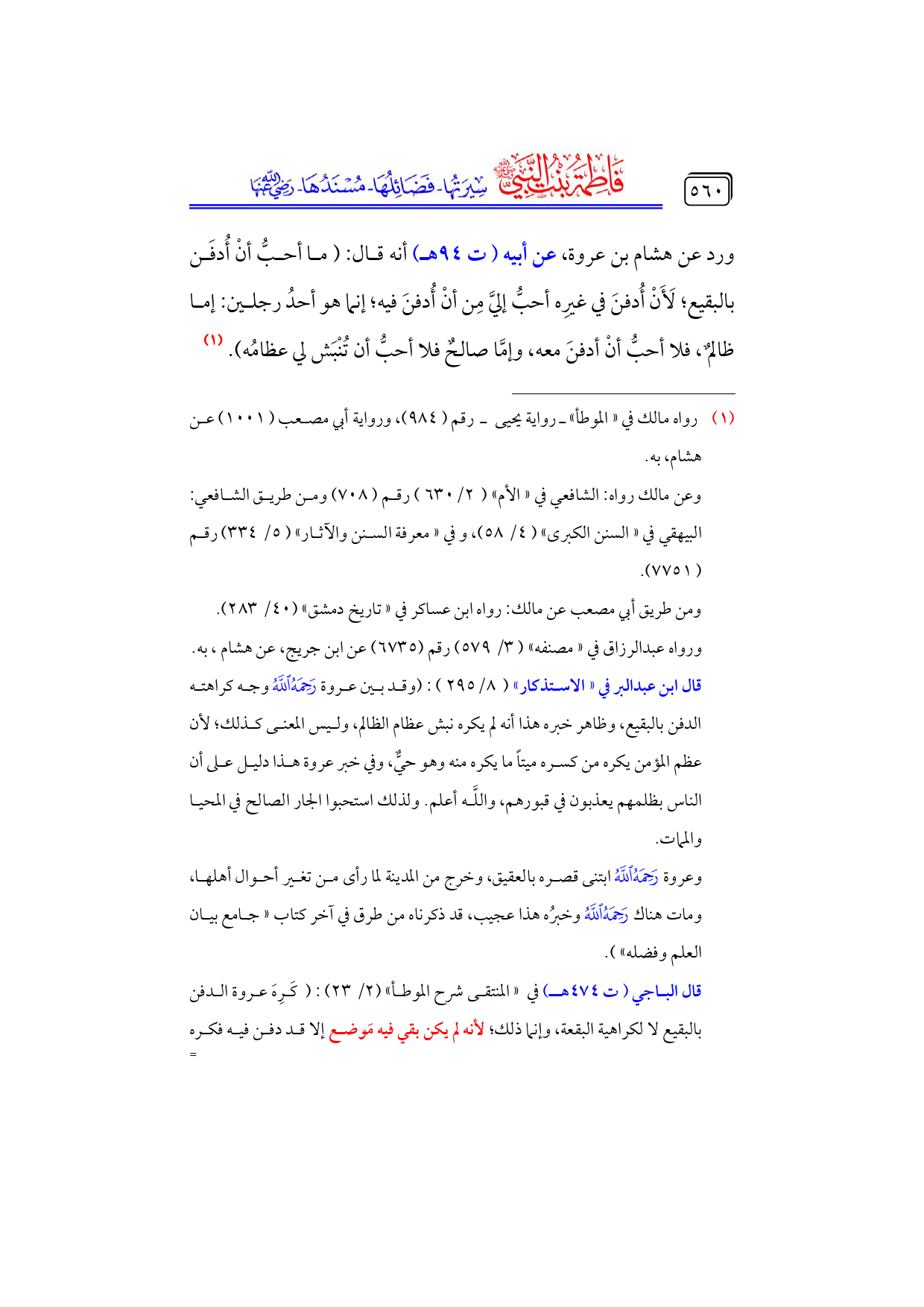 (¬١) رواه مالك في «الموطأ» ـ رواية يحيى ـ رقم (٩٨٤)، ورواية أبي مصعب (١٠٠١) عن هشام، به.