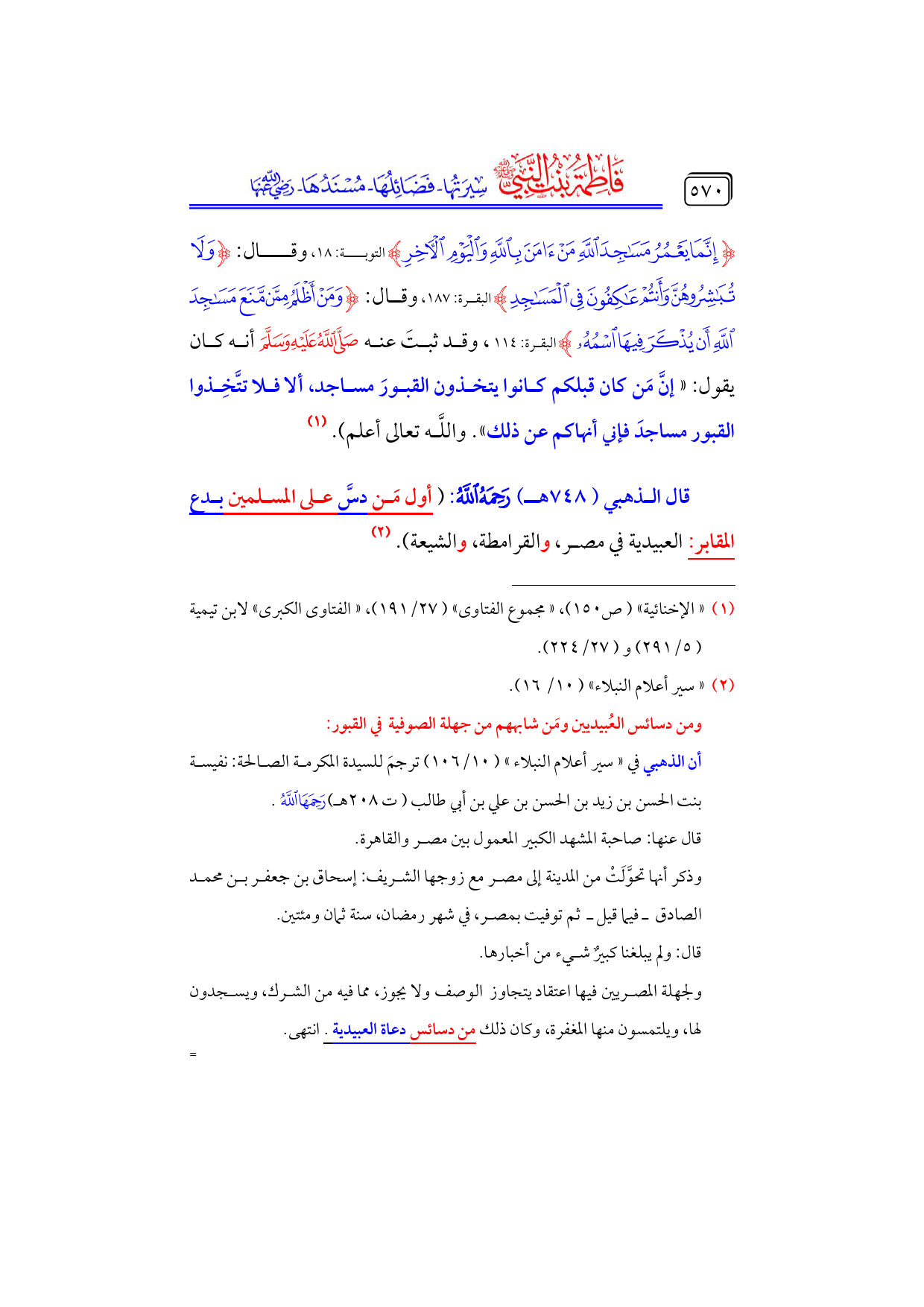 قال الذهبي (٧٤٨ هـ) - رحمه الله -: (أول مَن دسَّ على المسلمين بدع المقابر: العبيدية في مصر، والقرامطة، والشيعة). (¬٢)