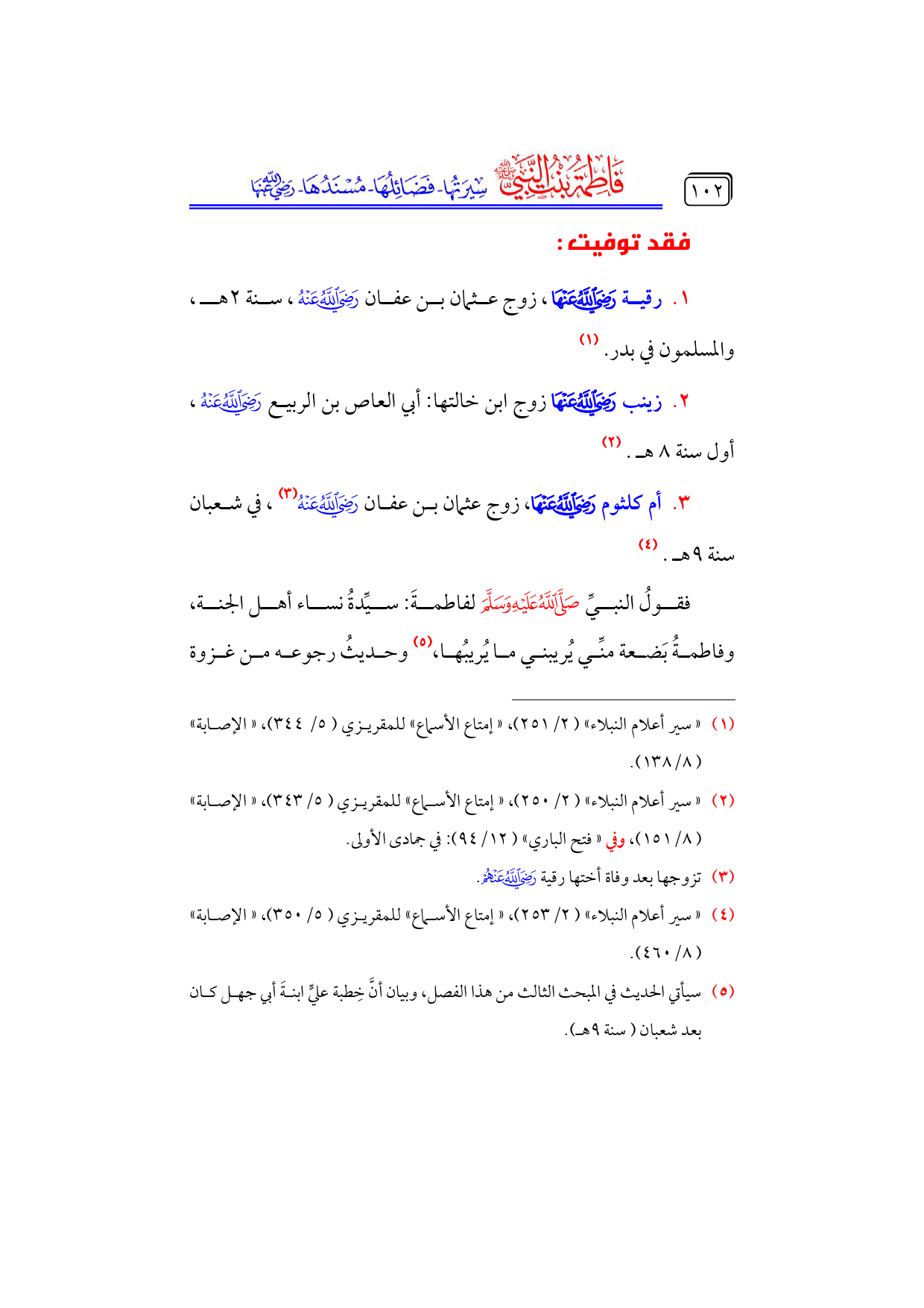 ١. رقية - رضي الله عنها -، زوج عثمان بن عفان - رضي الله عنه -، سنة ٢ هـ، والمسلمون في بدر. (¬١)