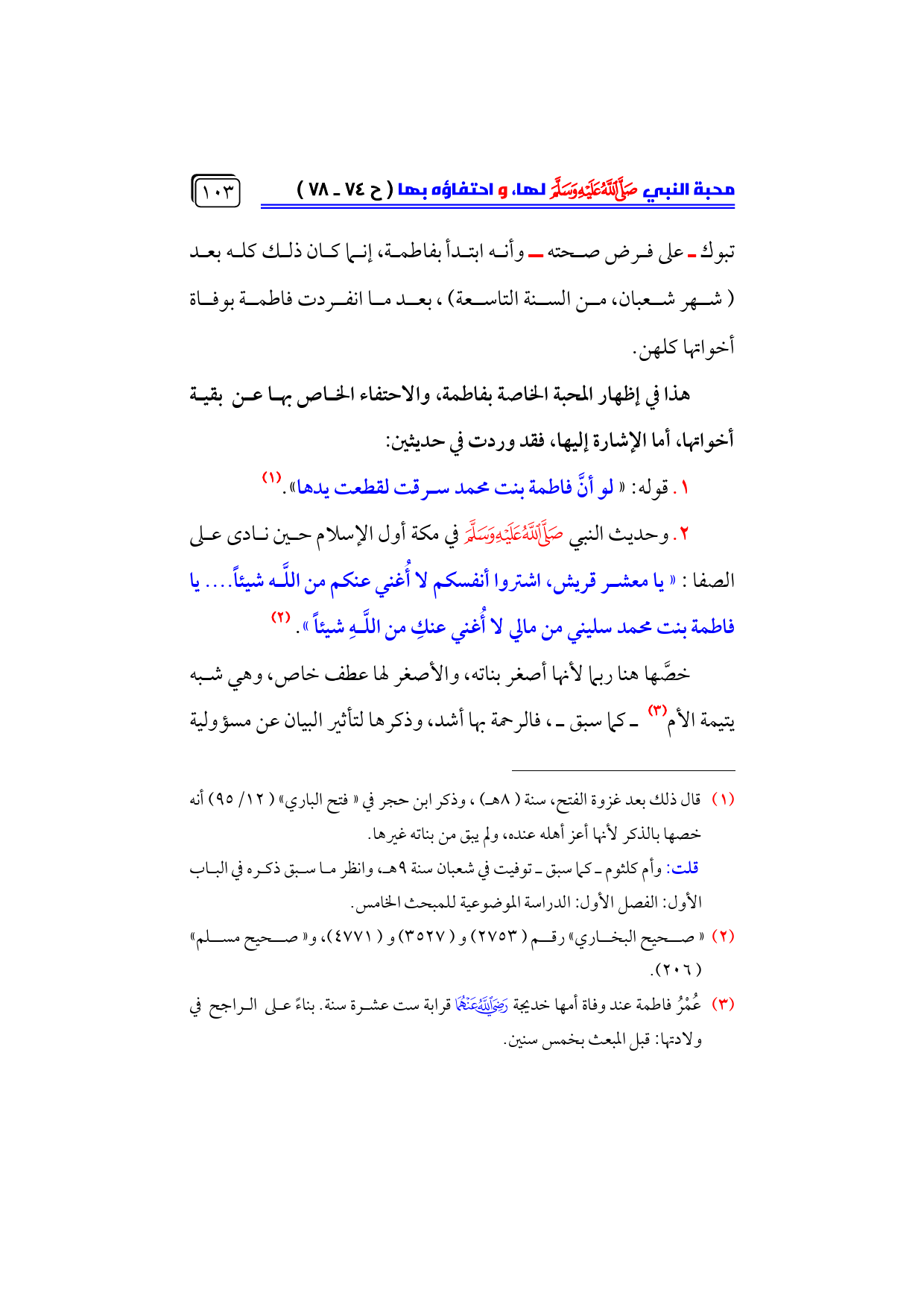 (¬١) قال ذلك بعد غزوة الفتح، سنة (٨ هـ)، وذكر ابن حجر في «فتح الباري» (١٢/ ٩٥) أنه خصها بالذكر لأنها أعز أهله عنده، ولم يبق من بناته غيرها.