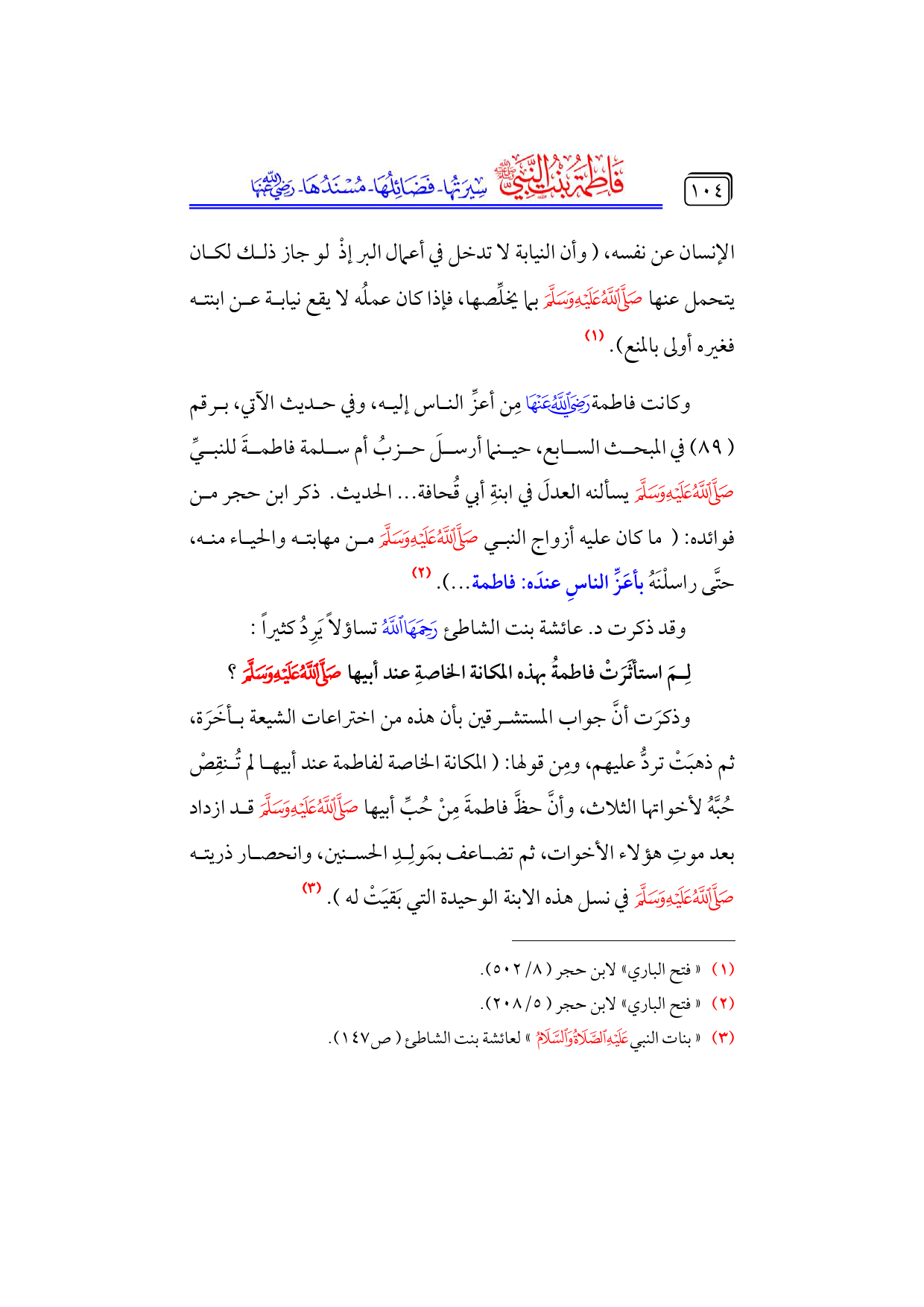 وكانت فاطمة - رضي الله عنها - مِن أعزِّ الناس إليه، وفي حديث الآتي، برقم ... (٨٩) في المبحث السابع، حينما أرسلَ حزبُ أم سلمة فاطمةَ للنبيِّ - صلى الله عليه وسلم - يسألنه العدلَ في ابنةِ أبي قُحافة ... الحديث. ذكر ابن حجر من فوائده: (ما كان عليه أزواج النبي - صلى الله عليه وسلم - من مهابته والحياء منه، حتَّى راسلْنَهُ بأعَزِّ الناسِ عندَه: فاطمة ... ). (¬٢)