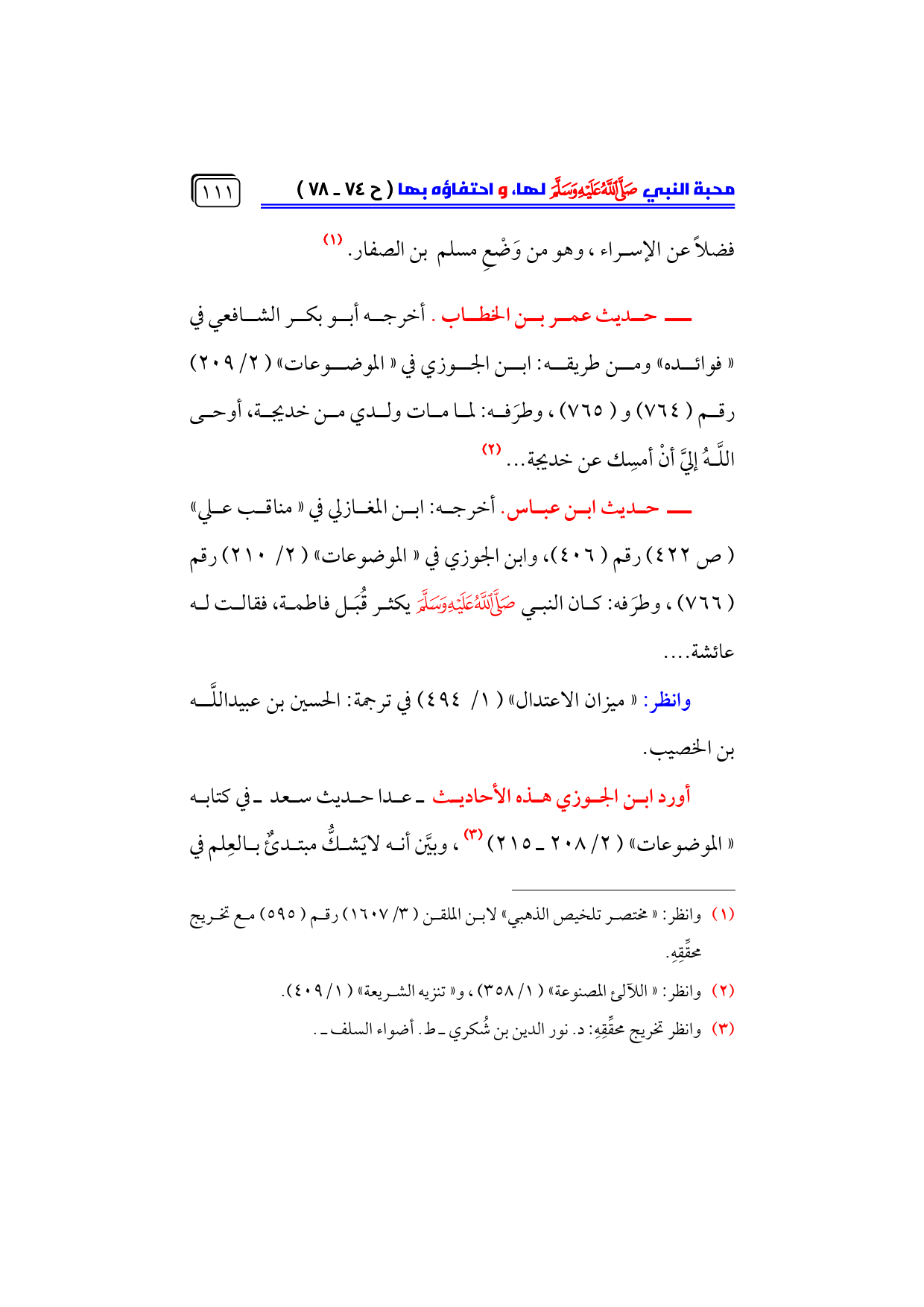 أورد ابن الجوزي هذه الأحاديث ـ عدا حديث سعد ـ في كتابه ... «الموضوعات» (٢/ ٢٠٨ ـ ٢١٥) (¬٣)، وبيَّن أنه لايَشكُّ مبتدئٌ بالعِلم في