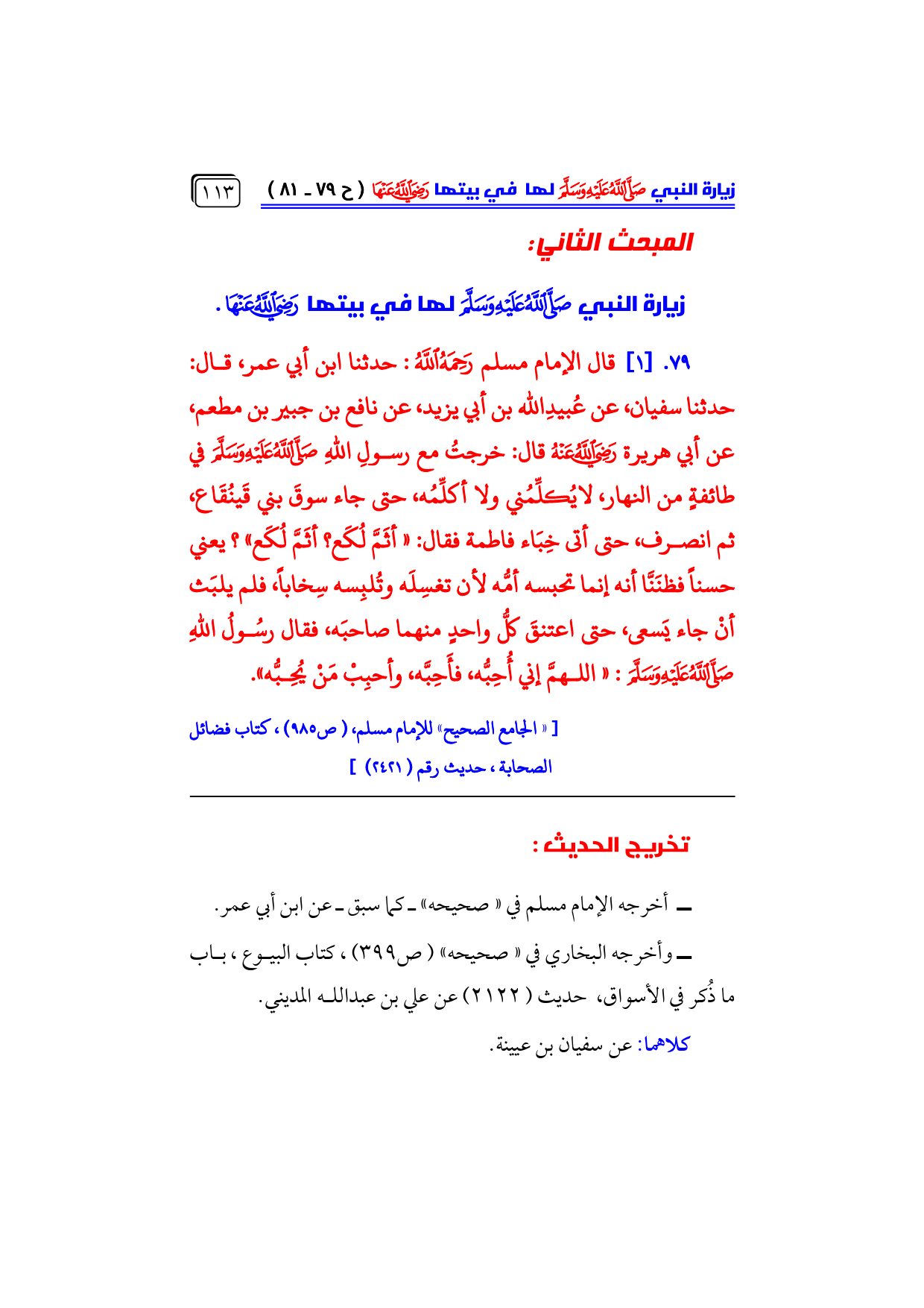 ٧٩. [١] قال الإمام مسلم - رحمه الله -: حدثنا ابن أبي عمر، قال: حدثنا سفيان، عن عُبيدِالله بن أبي يزيد، عن نافع بن جبير بن مطعم، عن أبي هريرة - رضي الله عنه - قال: خرجتُ مع رسولِ اللهِ - صلى الله عليه وسلم - في طائفةٍ من النهار، لايُكلِّمُني ولا أكلِّمُه، حتى جاء سوقَ بني قَينُقَاع، ثم انصرف، حتى أتى خِبَاء فاطمة فقال: «أثَمَّ لُكَع؟ أثَمَّ لُكَع»؟ يعني حسناً فظنَنَّا أنه إنما تحبسه أمُّه لأن تغسِلَه وتُلبِسه سِخاباً، فلم يلبَث أنْ جاء يَسعى، حتى اعتنقَ كلُّ واحدٍ منهما صاحبَه، فقال رسُولُ اللهِ - صلى الله عليه وسلم -: «اللهمَّ إني أُحِبُّه، فأَحِبَّه، وأحبِبْ مَنْ يُحِبُّه».